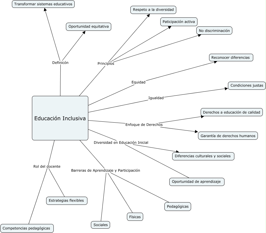Este Cmap, tiene información relacionada con: Educación Inclusiva, Educación Inclusiva Principios Paticipación activa, Educación Inclusiva Igualdad Condiciones justas, Educación Inclusiva Definicón Oportunidad equitativa, Educación Inclusiva Diversidad en Educación Inicial Diferencias culturales y sociales, Educación Inclusiva Principios Respeto a la diversidad, Educación Inclusiva Diversidad en Educación Inicial Oportunidad de aprendizaje, Educación Inclusiva Definicón Transformar sistemas educativos, Educación Inclusiva Equidad Reconocer diferencias, Educación Inclusiva Barreras de Aprendizaje y Participación Físicas, Educación Inclusiva Enfoque de Derechos Derechos a educación de calidad, Educación Inclusiva Rol del docente Estrategias flexibles, Educación Inclusiva Barreras de Aprendizaje y Participación Sociales, Educación Inclusiva Rol del docente Competencias pedagógicas, Educación Inclusiva Barreras de Aprendizaje y Participación Pedagógicas, Educación Inclusiva Enfoque de Derechos Garantía de derechos humanos, Educación Inclusiva Principios No discriminación