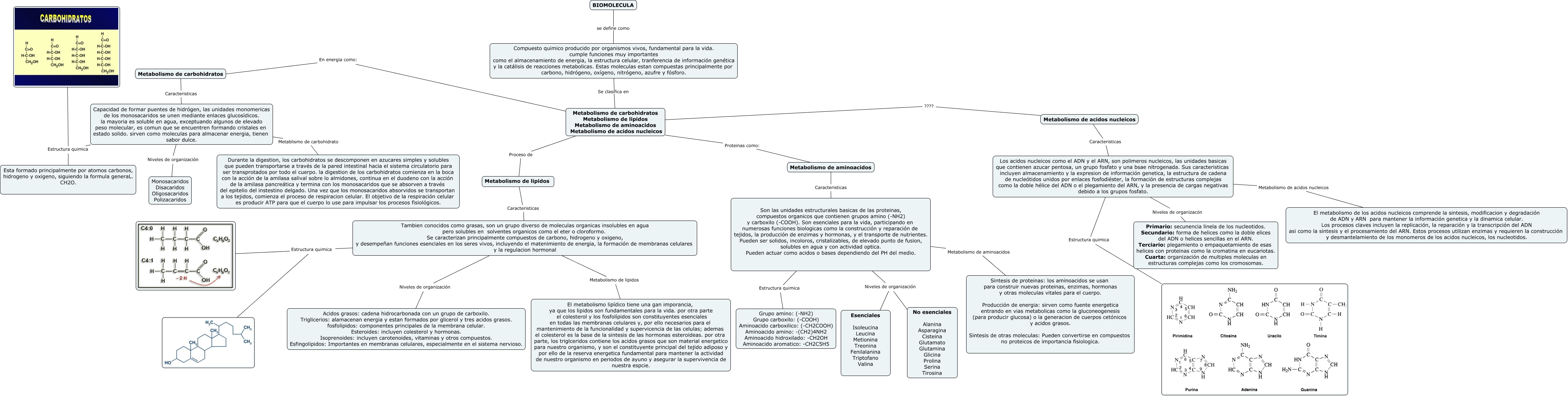 Este Cmap, tiene información relacionada con: fundamentos, Tambien conocidos como grasas, son un grupo diverso de moleculas organicas insolubles en agua pero solubles en solventes organicos como el eter o cloroformo. Se caracterizan principalmente compuestos de carbono, hidrogeno y oxigeno, y desempeñan funciones esenciales en los seres vivos, incluyendo el matenimiento de energia, la formación de membranas celulares y la regulacion hormonal Estructura quimica, Metabolismo de carbohidratos Metabolismo de lipidos Metabolismo de aminoacidos Metabolismo de acidos nucleicos Se clasifica en Compuesto quimico producido por organismos vivos, fundamental para la vida. cumple funciones muy importantes como el almacenamiento de energia, la estructura celular, tranferencia de información genética y la catálisis de reacciones metabolicas. Estas moleculas estan compuestas principalmente por carbono, hidrógeno, oxígeno, nitrógeno, azufre y fósforo., Tambien conocidos como grasas, son un grupo diverso de moleculas organicas insolubles en agua pero solubles en solventes organicos como el eter o cloroformo. Se caracterizan principalmente compuestos de carbono, hidrogeno y oxigeno, y desempeñan funciones esenciales en los seres vivos, incluyendo el matenimiento de energia, la formación de membranas celulares y la regulacion hormonal Niveles de organización Acidos grasos: cadena hidrocarbonada con un grupo de carboxilo. Triglicerios: alamacenan energia y estan formados por glicerol y tres acidos grasos. fosfolipidos: componentes principales de la membrana celular. Esteroides: incluyen colesterol y hormonas. Isoprenoides: incluyen carotenoides, vitaminas y otros compuestos. Esfingolipidos: Importantes en membranas celulares, especialmente en el sistema nervioso., Los acidos nucleicos como el ADN y el ARN, son polimeros nucleicos, las unidades basicas que contienen azucar pentosa, un grupo fosfato y una bsae nitrogenada. Sus caracteristicas incluyen almacenamiento y la expresion de información genetica, la estructura de cadena de nucleótidos unidos por enlaces fosfodiéster, la formación de estructuras complejas como la doble hélice del ADN o el plegamiento del ARN, y la presencia de cargas negativas debido a los grupos fosfato. Niveles de organizacón Primario: secunencia linela de los nucleotidos. Secundario: forma de helices como la doble elices del ADN o helices sencillas en el ARN. Terciario: plegamiento o empaquetamiento de esas helices con proteinas como la cromatina en eucariotas. Cuarta: organización de multiples moleculas en estructuras complejas como los cromosomas., Tambien conocidos como grasas, son un grupo diverso de moleculas organicas insolubles en agua pero solubles en solventes organicos como el eter o cloroformo. Se caracterizan principalmente compuestos de carbono, hidrogeno y oxigeno, y desempeñan funciones esenciales en los seres vivos, incluyendo el matenimiento de energia, la formación de membranas celulares y la regulacion hormonal Estructura quimica, Metabolismo de carbohidratos Metabolismo de lipidos Metabolismo de aminoacidos Metabolismo de acidos nucleicos ???? Metabolismo de acidos nucleicos, Los acidos nucleicos como el ADN y el ARN, son polimeros nucleicos, las unidades basicas que contienen azucar pentosa, un grupo fosfato y una bsae nitrogenada. Sus caracteristicas incluyen almacenamiento y la expresion de información genetica, la estructura de cadena de nucleótidos unidos por enlaces fosfodiéster, la formación de estructuras complejas como la doble hélice del ADN o el plegamiento del ARN, y la presencia de cargas negativas debido a los grupos fosfato. Estructura quimica, Metabolismo de carbohidratos Metabolismo de lipidos Metabolismo de aminoacidos Metabolismo de acidos nucleicos Proceso de Metabolismo de lipidos, Son las unidades estructurales basicas de las proteinas, compuestos organicos que contienen grupos amino (-NH2) y carboxilo (-COOH). Son esenciales para la vida, participando en numerosas funciones biologicas como la construcción y reparación de tejidos, la producción de enzimas y hormonas, y el transporte de nutrientes. Pueden ser solidos, incoloros, cristalizables, de elevado punto de fusion, solubles en agua y con actividad optica. Pueden actuar como acidos o bases dependiendo del PH del medio. Niveles de organización No esenciales Alanina Asparagina Cisteina Glutamato Glutamina Glicina Prolina Serina Tirosina, BIOMOLECULA se define como Compuesto quimico producido por organismos vivos, fundamental para la vida. cumple funciones muy importantes como el almacenamiento de energia, la estructura celular, tranferencia de información genética y la catálisis de reacciones metabolicas. Estas moleculas estan compuestas principalmente por carbono, hidrógeno, oxígeno, nitrógeno, azufre y fósforo., Metabolismo de carbohidratos Metabolismo de lipidos Metabolismo de aminoacidos Metabolismo de acidos nucleicos En energia como: Metabolismo de carbohidratos, Tambien conocidos como grasas, son un grupo diverso de moleculas organicas insolubles en agua pero solubles en solventes organicos como el eter o cloroformo. Se caracterizan principalmente compuestos de carbono, hidrogeno y oxigeno, y desempeñan funciones esenciales en los seres vivos, incluyendo el matenimiento de energia, la formación de membranas celulares y la regulacion hormonal Metabolismo de lipidos El metabolismo lipídico tiene una gan imporancia, ya que los lipidos son fundamentales para la vida. por otra parte el colesterol y los fosfolípidos son constituyentes esenciales en todas las membranas celulares y, por ello necesarios para el mantenimiento de la funcionalidad y supervicencia de las celulas; ademas el colesterol es la base de la sintesis de las hormonas esteroideas. por otra parte, los triglceridos contiene los acidos grasos que son material energetico para nuestro organismo, y son el constituyente principal del tejido adiposo y por ello de la reserva energetica fu