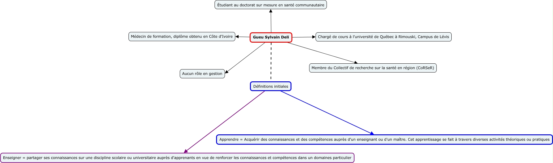 Cette carte de concepts créée avec IHMC CmapTools traite de: Présentation_Gueu Sylvain_Deli, Définitions initiales Enseigner = partager ses connaissances sur une discipline scolaire ou universitaire auprès d'apprenants en vue de renforcer les connaissances et compétences dans un domaines particulier, Gueu Sylvain Deli Étudiant au doctorat sur mesure en santé communautaire, Définitions initiales Apprendre = Acquérir des connaissances et des compétences auprès d'un enseignant ou d'un maître. Cet apprentissage se fait à travers diverses activités théoriques ou pratiques, Gueu Sylvain Deli Membre du Collectif de recherche sur la santé en région (CoRSeR), Gueu Sylvain Deli Médecin de formation, diplôme obtenu en Côte d'Ivoire, Gueu Sylvain Deli Définitions initiales, Gueu Sylvain Deli Aucun rôle en gestion, Gueu Sylvain Deli Chargé de cours à l'université de Québec à Rimouski, Campus de Lévis