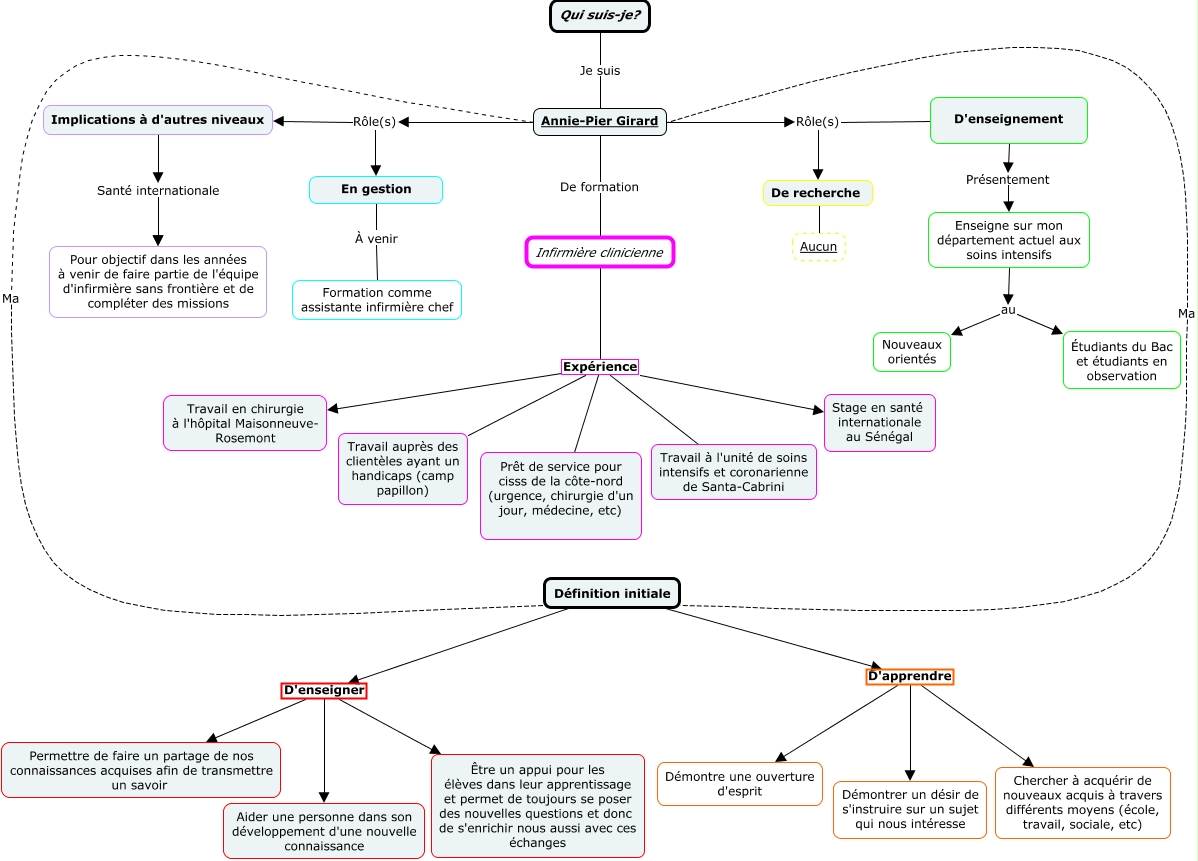 Cette carte de concepts créée avec IHMC CmapTools traite de: Presentation_APGirard, Implications à d'autres niveaux Santé internationale Pour objectif dans les années à venir de faire partie de l'équipe d'infirmière sans frontière et de compléter des missions, Annie-Pier Girard Rôle(s) En gestion, Définition initiale D'enseigner Aider une personne dans son développement d'une nouvelle connaissance, Définition initiale D'enseigner Permettre de faire un partage de nos connaissances acquises afin de transmettre un savoir, Enseigne sur mon département actuel aux soins intensifs au Nouveaux orientés, Qui suis-je? Je suis Annie-Pier Girard, De recherche Aucun, Implications à d'autres niveaux Santé internationale Pour objectif dans les années à venir de faire partie de l'équipe d'infirmière sans frontière et de compléter des missions, Définition initiale D'enseigner Être un appui pour les élèves dans leur apprentissage et permet de toujours se poser des nouvelles questions et donc de s'enrichir nous aussi avec ces échanges, Annie-Pier Girard Rôle(s) D'enseignement, Infirmière clinicienne Expérience Travail à l'unité de soins intensifs et coronarienne de Santa-Cabrini, Enseigne sur mon département actuel aux soins intensifs au Étudiants du Bac et étudiants en observation, Infirmière clinicienne Expérience Travail en chirurgie à l'hôpital Maisonneuve- Rosemont, En gestion À venir Formation comme assistante infirmière chef, Infirmière clinicienne Expérience Travail auprès des clientèles ayant un handicaps (camp papillon), Annie-Pier Girard Rôle(s) De recherche, Annie-Pier Girard Rôle(s) Implications à d'autres niveaux, Annie-Pier Girard Ma Définition initiale, Annie-Pier Girard De formation Infirmière clinicienne, D'enseignement Présentement Enseigne sur mon département actuel aux soins intensifs