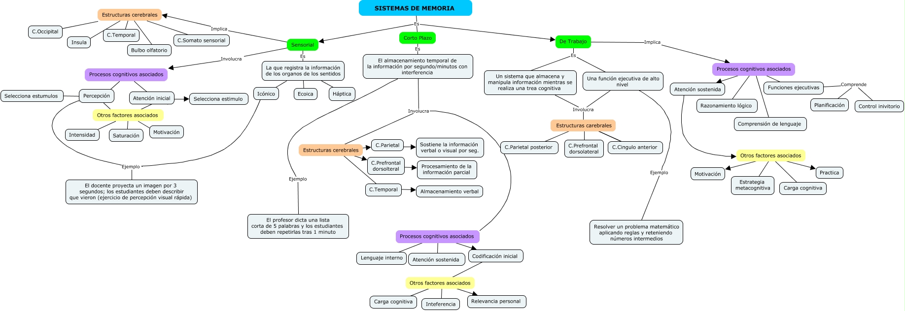 Este Cmap, tiene información relacionada con: SISTEMAS DE MEMORIA 2, Otros factores asociados ???? Practica, El almacenamiento temporal de la información por segundo/minutos con interferencia Involucra Estructuras cerebrales, Un sistema que almacena y manipula información mientras se realiza una trea cognitiva Involucra Estructuras carebrales, Funciones ejecutivas Comprende Planificación, SISTEMAS DE MEMORIA Es Corto Plazo, Estructuras cerebrales ???? C.Parietal, Otros factores asociados ???? Estrategia metacognitiva, La que registra la información de los organos de los sentidos ???? Icónico, Procesos cognitivos asociados ???? Percepción, SISTEMAS DE MEMORIA Es Sensorial, Procesos cognitivos asociados ???? Comprensión de lenguaje, Atención inicial ???? Selecciona estimulo, Otros factores asociados ???? Inteferencia, Una función ejecutiva de alto nivel Involucra Estructuras carebrales, C.Prefrontal dorsolateral ???? C.Parietal posterior, Otros factores asociados ???? Motivación, Sensorial Involucra Procesos cognitivos asociados, Otros factores asociados ???? Saturación, Estructuras cerebrales ???? C.Temporal, C.Prefrontal dorsolteral ???? Procesamiento de la información parcial
