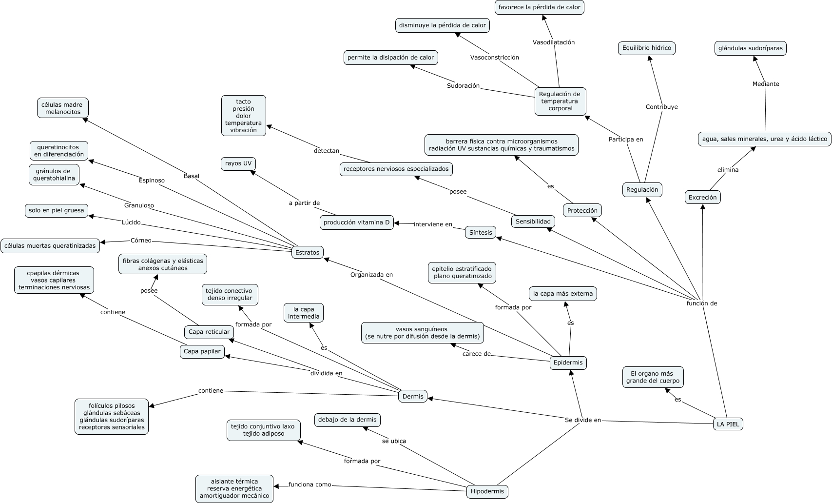 Este Cmap, tiene información relacionada con: Anatomía de la piel, Estratos Basal células madre melanocitos, Hipodermis formada por tejido conjuntivo laxo tejido adiposo, Regulación de temperatura corporal Vasoconstricción disminuye la pérdida de calor, Estratos Espinoso queratinocitos en diferenciación, Sensibilidad posee receptores nerviosos especializados, Epidermis Organizada en Estratos, producción vitamina D a partir de rayos UV, agua, sales minerales, urea y ácido láctico Mediante glándulas sudoríparas, LA PIEL Se divide en Hipodermis, Dermis dividida en Capa reticular, LA PIEL función de Síntesis, Estratos Córneo células muertas queratinizadas, Regulación de temperatura corporal Vasodilatación favorece la pérdida de calor, Regulación de temperatura corporal Sudoración permite la disipación de calor, Hipodermis se ubica debajo de la dermis, LA PIEL función de Protección, Capa papilar contiene cpapilas dérmicas vasos capilares terminaciones nerviosas, LA PIEL función de Excreción, Epidermis es la capa más externa, Regulación Contribuye Equilibrio hidrico