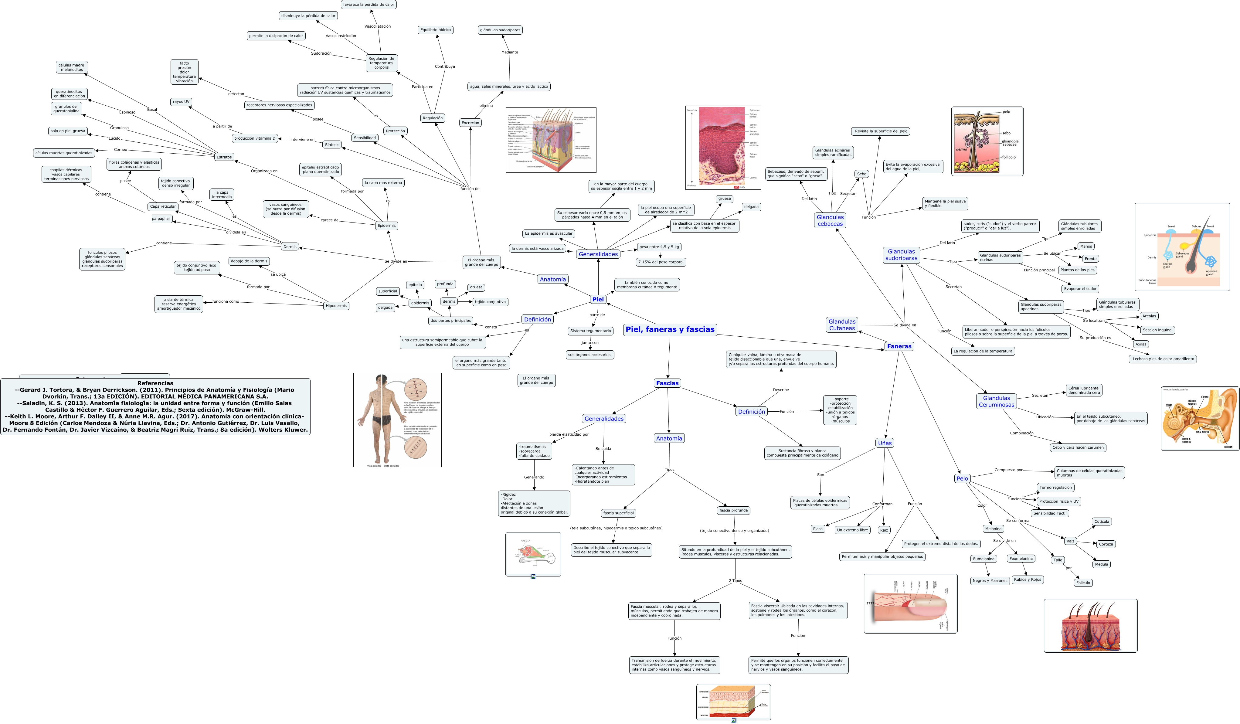 Este Cmap, tiene información relacionada con: 14 sept Piel, faneras y fascias terminado faneras, Dermis formada por tejido conectivo denso irregular, -traumatismos -sobrecarga -falta de cuidado Generando -Rigidez -Dolor -Afectación a zonas distantes de una lesión original debido a su conexión global., Piel, faneras y fascias Fascias, Pelo Compuesto por Columnas de células queratinizadas muertas, Generalidades Se cuida -Calentando antes de cualquier actividad -Incorporando estiramientos -Hidratándote bien, Faneras Uñas, Definición es una estructura semipermeable que cubre la superficie externa del cuerpo, Faneras Glandulas Cutaneas, Generalidades la piel ocupa una superficie de alrededor de 2 m^2, dermis profunda, Hipodermis funciona como aislante térmica reserva energética amortiguador mecánico, Estratos Córneo células muertas queratinizadas, Piel parte de Sistema tegumentario, El organo más grande del cuerpo Se divide en Hipodermis, Dermis dividida en Capa papilar, Regulación de temperatura corporal Vasodilatación favorece la pérdida de calor, Generalidades se clasifica con base en el espesor relativo de la sola epidermis, fascia superficial (tela subcutánea, hipodermis o tejido subcutáneo) Describe el tejido conectivo que separa la piel del tejido muscular subyacente., dos partes principales epidermis, Glandulas sudoriparas Secretan Liberan sudor o perspiración hacia los folículos pilosos o sobre la superficie de la piel a través de poros.