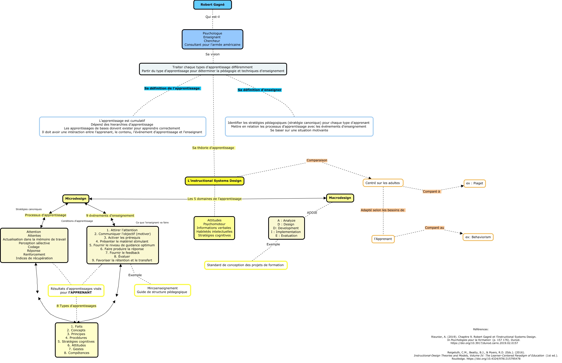 Cette carte de concepts créée avec IHMC CmapTools traite de: Chapitre 9. Robert Gagné et l'ISD, Traiter chaque types d'apprentissage différemment Partir du type d'apprentissage pour déterminer la pédagogie et techniques d'enseignement Sa théorie d'apprentissage L'instructional Systems Design, Résultats d'apprentissages visés pour l'APPRENANT 8 Types d'apprentissages 1. Faits 2. Concepts 3. Principes 4. Procédures 5. Stratégies cognitives 6. Attitudes 7. Gestes 8. Compétences, L'instructional Systems Design Les 5 domaines de l'apprentissage Attitudes Psychomoteur Informations verbales Habiletés intelectuelles Stratégies cognitives, l'Apprenant Comparé au ex: Behaviorism, L'instructional Systems Design Les 5 domaines de l'apprentissage Macrodesign, Microdesign Processus d'apprentissage Attention Attentes Actualisation dans la mémoire de travail Perception sélective Codage Réponse Renforcement Indices de récupération, Centré sur les adultes Comparé à ex : Piaget, Microdesign 9 événements d'enseignement 1. Attirer l'attention 2. Communiquer l'objectif (motiver) 3. Activer les prérequis 4. Présenter le matériel stimulant 5. Fournir le niveau de guidance optimum 6. Faire produire la réponse 7. Fournir le feedback 8. Évaluer 9. Favoriser la rétention et le transfert, L'instructional Systems Design Comparaison Centré sur les adultes, Macrodesign ADDIE A : Analyze D : Design D: Development I : Implementation E : Evaluation, 1. Attirer l'attention 2. Communiquer l'objectif (motiver) 3. Activer les prérequis 4. Présenter le matériel stimulant 5. Fournir le niveau de guidance optimum 6. Faire produire la réponse 7. Fournir le feedback 8. Évaluer 9. Favoriser la rétention et le transfert Exemple Mircoenseignement Guide de structure pédagogique, Attention Attentes Actualisation dans la mémoire de travail Perception sélective Codage Réponse Renforcement Indices de récupération 1. Faits 2. Concepts 3. Principes 4. Procédures 5. Stratégies cognitives 6. Attitudes 7. Gestes 8. Compétences, Centré sur les adultes Adapté selon les besoins de l'Apprenant, L'instructional Systems Design Les 5 domaines de l'apprentissage Microdesign, Traiter chaque types d'apprentissage différemment Partir du type d'apprentissage pour déterminer la pédagogie et techniques d'enseignement Sa définition d'enseigner Identifier les stratégies pédagoqiques (stratégie canonique) pour chaque type d'apprenant Mettre en relation les processus d'apprentissage avec les événements d'enseignement Se baser sur une situation motivante, Robert Gagné Qui est-il Psychologue Enseignant Chercheur Consultant pour l'armée américaine, Résultats d'apprentissages visés pour l'APPRENANT 1. Attirer l'attention 2. Communiquer l'objectif (motiver) 3. Activer les prérequis 4. Présenter le matériel stimulant 5. Fournir le niveau de guidance optimum 6. Faire produire la réponse 7. Fournir le feedback 8. Évaluer 9. Favoriser la rétention et le transfert, A : Analyze D : Design D: Development I : Implementation E : Evaluation Exemple Standard de conception des projets de formation, Psychologue Enseignant Chercheur Consultant pour l'armée américaine Sa vision Traiter chaque types d'apprentissage différemment Partir du type d'apprentissage pour déterminer la pédagogie et techniques d'enseignement, 1. Attirer l'attention 2. Communiquer l'objectif (motiver) 3. Activer les prérequis 4. Présenter le matériel stimulant 5. Fournir le niveau de guidance optimum 6. Faire produire la réponse 7. Fournir le feedback 8. Évaluer 9. Favoriser la rétention et le transfert 1. Faits 2. Concepts 3. Principes 4. Procédures 5. Stratégies cognitives 6. Attitudes 7. Gestes 8. Compétences