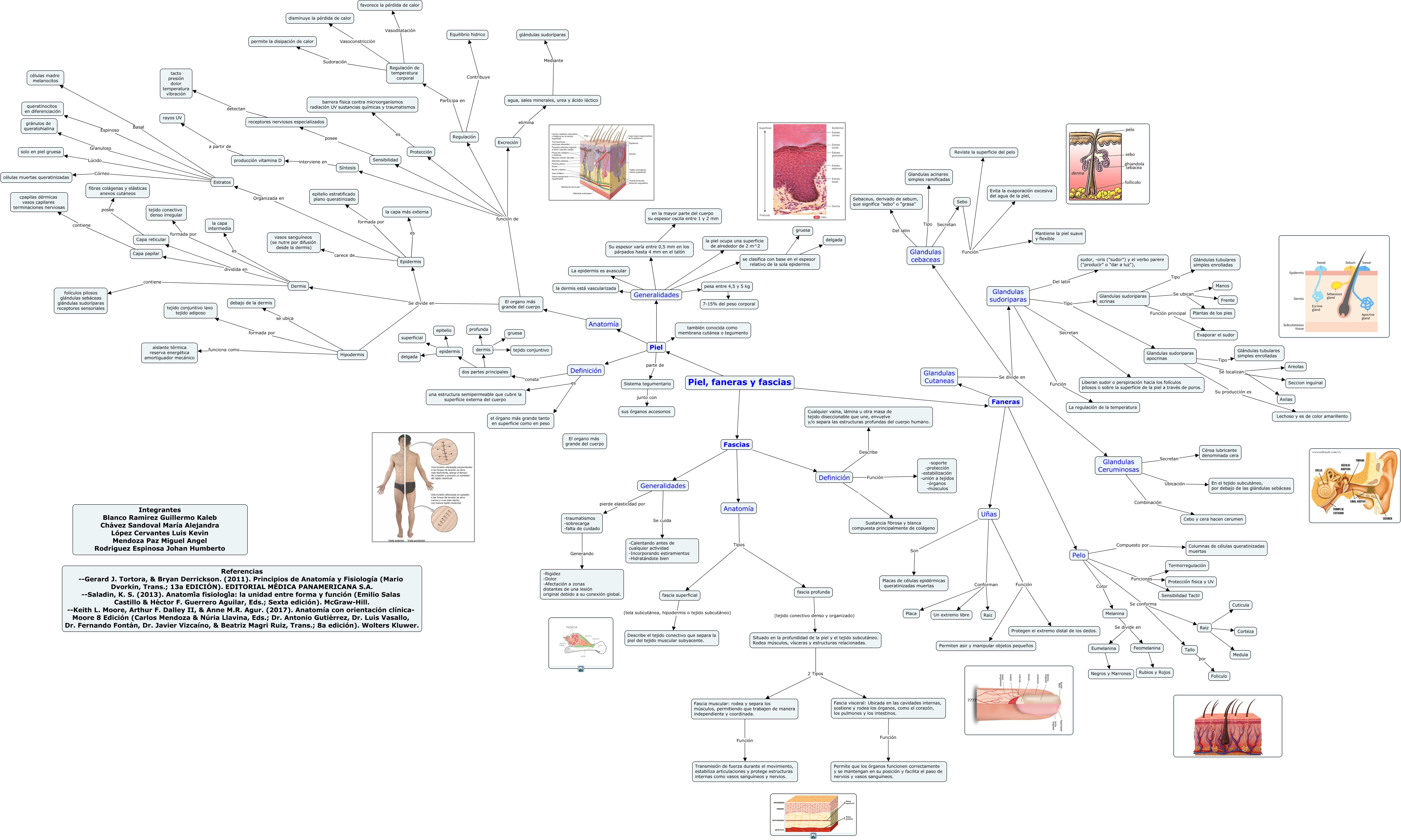 Este Cmap, tiene información relacionada con: 14 sept Piel, faneras y fascias terminado faneras 2, Dermis formada por tejido conectivo denso irregular, -traumatismos -sobrecarga -falta de cuidado Generando -Rigidez -Dolor -Afectación a zonas distantes de una lesión original debido a su conexión global., Piel, faneras y fascias Fascias, Pelo Compuesto por Columnas de células queratinizadas muertas, Generalidades Se cuida -Calentando antes de cualquier actividad -Incorporando estiramientos -Hidratándote bien, Faneras Uñas, Definición es una estructura semipermeable que cubre la superficie externa del cuerpo, Faneras Glandulas Cutaneas, Generalidades la piel ocupa una superficie de alrededor de 2 m^2, dermis profunda, Hipodermis funciona como aislante térmica reserva energética amortiguador mecánico, Estratos Córneo células muertas queratinizadas, Piel parte de Sistema tegumentario, El organo más grande del cuerpo Se divide en Hipodermis, Dermis dividida en Capa papilar, Regulación de temperatura corporal Vasodilatación favorece la pérdida de calor, Generalidades se clasifica con base en el espesor relativo de la sola epidermis, fascia superficial (tela subcutánea, hipodermis o tejido subcutáneo) Describe el tejido conectivo que separa la piel del tejido muscular subyacente., dos partes principales epidermis, Glandulas sudoriparas Secretan Liberan sudor o perspiración hacia los folículos pilosos o sobre la superficie de la piel a través de poros.