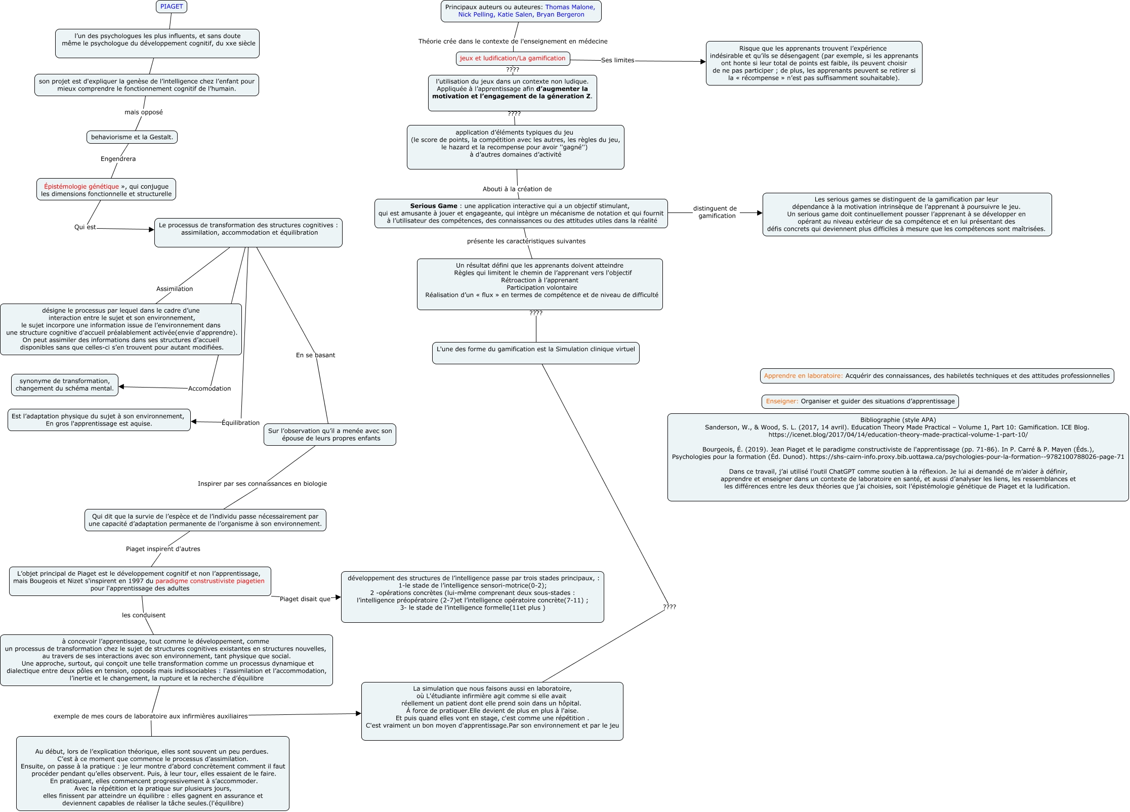 Cette carte de concepts créée avec IHMC CmapTools traite de: Chapitre 4 Piaget et le paradigme constructiviste de l'apprentissage, Serious Game : une application interactive qui a un objectif stimulant, qui est amusante à jouer et engageante, qui intègre un mécanisme de notation et qui fournit à l’utilisateur des compétences, des connaissances ou des attitudes utiles dans la réalité présente les caractéristiques suivantes Un résultat défini que les apprenants doivent atteindre Règles qui limitent le chemin de l’apprenant vers l'objectif Rétroaction à l’apprenant Participation volontaire Réalisation d’un « flux » en termes de compétence et de niveau de difficulté, à concevoir l’apprentissage, tout comme le développement, comme un processus de transformation chez le sujet de structures cognitives existantes en structures nouvelles, au travers de ses interactions avec son environnement, tant physique que social. Une approche, surtout, qui conçoit une telle transformation comme un processus dynamique et dialectique entre deux pôles en tension, opposés mais indissociables : l’assimilation et l’accommodation, l’inertie et le changement, la rupture et la recherche d’équilibre exemple de mes cours de laboratoire aux infirmières auxiliaires La simulation que nous faisons aussi en laboratoire, où L'étudiante infirmière agit comme si elle avait réellement un patient dont elle prend soin dans un hôpital. À force de pratiquer.Elle devient de plus en plus à l'aise. Et puis quand elles vont en stage, c'est comme une répétition . C'est vraiment un bon moyen d'apprentissage.Par son environnement et par le jeu, PIAGET ???? l’un des psychologues les plus influents, et sans doute même le psychologue du développement cognitif, du xxe siècle, Sur l’observation qu’il a menée avec son épouse de leurs propres enfants Inspirer par ses connaissances en biologie Qui dit que la survie de l’espèce et de l’individu passe nécessairement par une capacité d’adaptation permanente de l’organisme à son environnement., jeux et ludification/La gamification ???? l’utilisation du jeux dans un contexte non ludique. Appliquée à l’apprentissage afin d’augmenter la motivation et l’engagement de la géneration Z., Épistémologie génétique », qui conjugue les dimensions fonctionnelle et structurelle Qui est Le processus de transformation des structures cognitives : assimilation, accommodation et équilibration, l’utilisation du jeux dans un contexte non ludique. Appliquée à l’apprentissage afin d’augmenter la motivation et l’engagement de la géneration Z. ???? application d’éléments typiques du jeu (le score de points, la compétition avec les autres, les règles du jeu, le hazard et la recompense pour avoir ''gagné'') à d’autres domaines d’activité, Le processus de transformation des structures cognitives : assimilation, accommodation et équilibration Assimilation désigne le processus par lequel dans le cadre d’une interaction entre le sujet et son environnement, le sujet incorpore une information issue de l’environnement dans une structure cognitive d'accueil préalablement activée(envie d'apprendre). On peut assimiler des informations dans ses structures d’accueil disponibles sans que celles-ci s’en trouvent pour autant modifiées., L'une des forme du gamification est la Simulation clinique virtuel ???? La simulation que nous faisons aussi en laboratoire, où L'étudiante infirmière agit comme si elle avait réellement un patient dont elle prend soin dans un hôpital. À force de pratiquer.Elle devient de plus en plus à l'aise. Et puis quand elles vont en stage, c'est comme une répétition . C'est vraiment un bon moyen d'apprentissage.Par son environnement et par le jeu, Le processus de transformation des structures cognitives : assimilation, accommodation et équilibration En se basant Sur l’observation qu’il a menée avec son épouse de leurs propres enfants, son projet est d'expliquer la genèse de l’intelligence chez l’enfant pour mieux comprendre le fonctionnement cognitif de l’humain. mais opposé behaviorisme et la Gestalt., L’objet principal de Piaget est le développement cognitif et non l’apprentissage, mais Bougeois et Nizet s'inspirent en 1997 du paradigme construstiviste piagetien pour l'apprentissage des adultes Piaget disait que développement des structures de l’intelligence passe par trois stades principaux, : 1-le stade de l’intelligence sensori-motrice(0-2); 2 -opérations concrètes (lui-même comprenant deux sous-stades : l’intelligence préopératoire (2-7)et l’intelligence opératoire concrète(7-11) ; 3- le stade de l’intelligence formelle(11et plus ), l’un des psychologues les plus influents, et sans doute même le psychologue du développement cognitif, du xxe siècle ???? son projet est d'expliquer la genèse de l’intelligence chez l’enfant pour mieux comprendre le fonctionnement cognitif de l’humain., jeux et ludification/La gamification Ses limites Risque que les apprenants trouvent l’expérience indésirable et qu’ils se désengagent (par exemple, si les apprenants ont honte si leur total de points est faible, ils peuvent choisir de ne pas participer ; de plus, les apprenants peuvent se retirer si la « récompense » n’est pas suffisamment souhaitable)., Qui dit que la survie de l’espèce et de l’individu passe nécessairement par une capacité d’adaptation permanente de l’organisme à son environnement. Piaget inspirent d'autres L’objet principal de Piaget est le développement cognitif et non l’apprentissage, mais Bougeois et Nizet s'inspirent en 1997 du paradigme construstiviste piagetien pour l'apprentissage des adultes, Un résultat défini que les apprenants doivent atteindre Règles qui limitent le chemin de l’apprenant vers l'objectif Rétroaction à l’apprenant Participation volontaire Réalisation d’un « flux