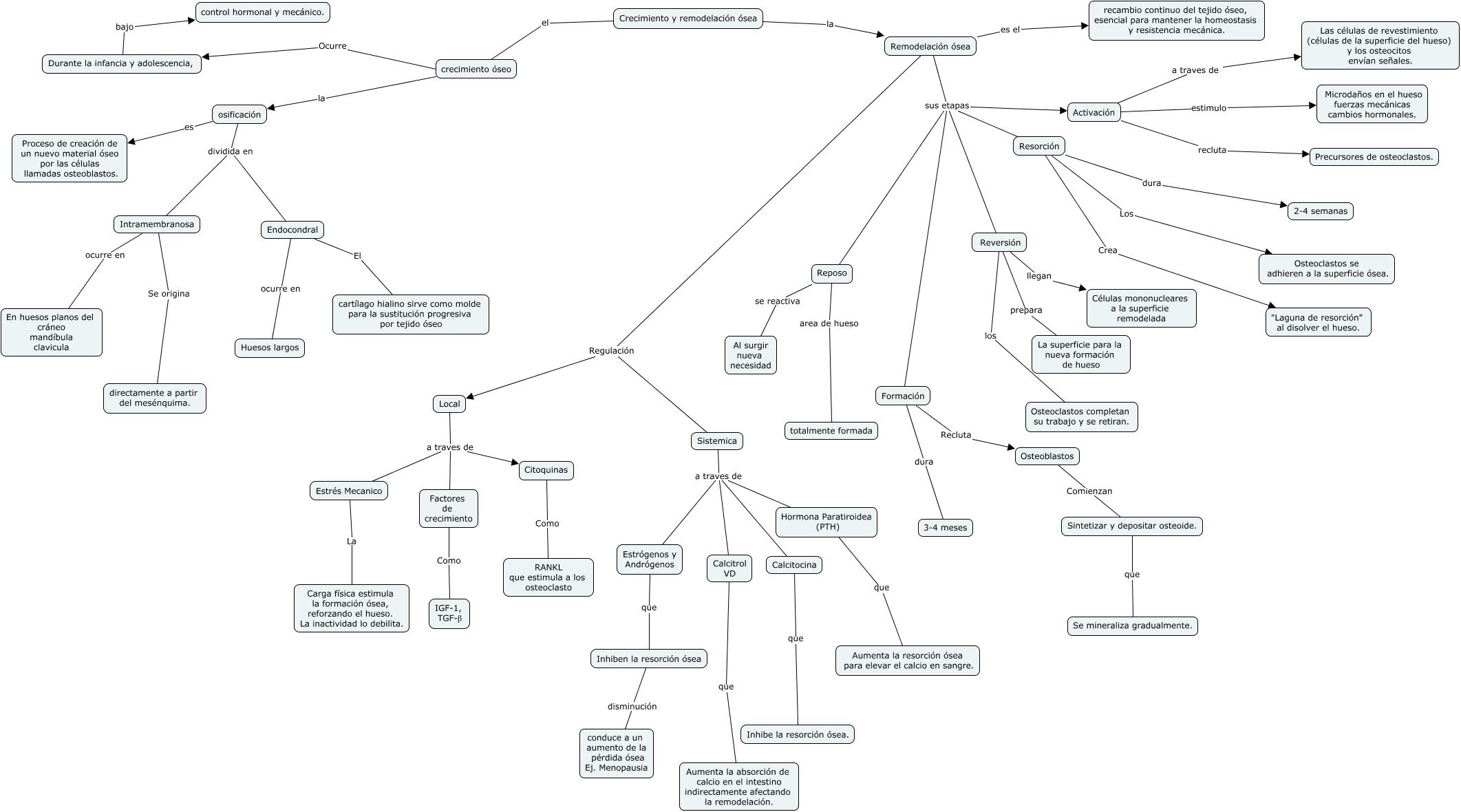 Este Cmap, tiene información relacionada con: Crecimiento y remodelación ósea, Activación estimulo Microdaños en el hueso fuerzas mecánicas cambios hormonales., Local a traves de Factores de crecimiento, crecimiento óseo la osificación, Local a traves de Citoquinas, Resorción Los Osteoclastos se adhieren a la superficie ósea., Durante la infancia y adolescencia, bajo control hormonal y mecánico., Reposo se reactiva Al surgir nueva necesidad, Inhiben la resorción ósea disminución conduce a un aumento de la pérdida ósea Ej. Menopausia, Remodelación ósea sus etapas Activación, Calcitocina que Inhibe la resorción ósea., crecimiento óseo Ocurre Durante la infancia y adolescencia,, Citoquinas Como RANKL que estimula a los osteoclasto, Remodelación ósea sus etapas Resorción, Crecimiento y remodelación ósea el crecimiento óseo, Resorción dura 2-4 semanas, Osteoblastos Comienzan Sintetizar y depositar osteoide., Reversión prepara La superficie para la nueva formación de hueso, Hormona Paratiroidea (PTH) que Aumenta la resorción ósea para elevar el calcio en sangre., Intramembranosa ocurre en En huesos planos del cráneo mandíbula clavicula, osificación dividida en Intramembranosa