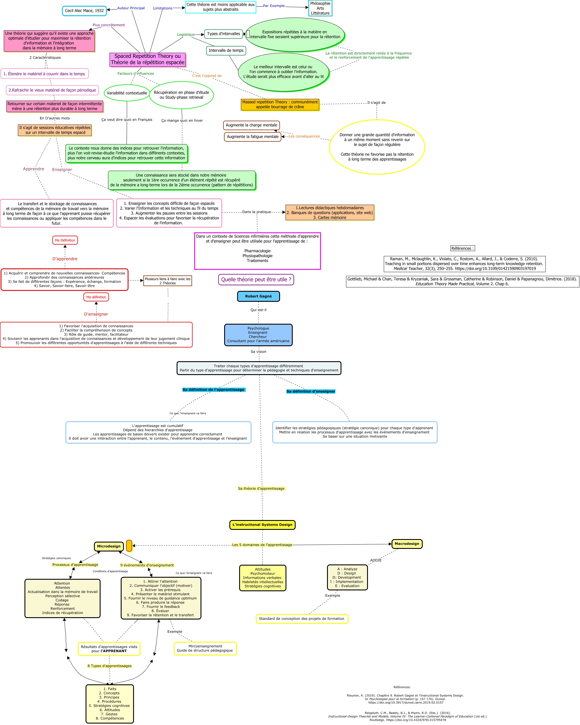 Cette carte de concepts créée avec IHMC CmapTools traite de: Spaced Repetition Theory et L'ISD_MFroussel, Variabilité contextuelle Ça veut dire quoi en Français Le contexte nous donne des indices pour retrouver l'information, plus l'on voit-revise-étudie l'information dans différents contextes, plus notre cerveau aura d'indices pour retrouver cette information, Donner une grande quantité d'information à un même moment sans revenir sur le sujet de façon régulière Cette théorie ne favorise pas la rétention à long terme des apprentissages Les conséquences Augmente la charge mentale, Spaced Repetition Theory ou Théorie de la répétition espacée Facteurs d'influences Récupération en phase d'étude ou Study-phase retrieval, 1. Enseigner les concepts difficile de façon espacés 2. Varier l'Information et les techniques au fil du temps 3. Augmenter les pauses entre les sessions 4. Espacer les évaluations pour favoriser la récupération de l'information. Dans la pratique Dans un contexte de Sciences infirmières cette méthode d'apprendre et d'enseigner peut être utilisée pour l'apprentissage de : Pharmacologie Physiopathologie Traitements, L'instructional Systems Design Les 5 domaines de l'apprentissage Attitudes Psychomoteur Informations verbales Habiletés intellectuelles Stratégies cognitives, 1. Enseigner les concepts difficile de façon espacés 2. Varier l'Information et les techniques au fil du temps 3. Augmenter les pauses entre les sessions 4. Espacer les évaluations pour favoriser la récupération de l'information. Dans la pratique 1.Lectures didactiques hebdomadaires 2. Banques de questions (applications, site web) 3. Cartes mémoire, Cette théorie est moins applicable aux sujets plus abstraits Par Exemple Philosophie Arts Littérature, Spaced Repetition Theory ou Théorie de la répétition espacée Plus concrètement Une théorie qui suggère qu'il existe une approche optimale d'étudier pour maximiser la rétention d'information et l'intégration dans la mémoire à long terme, Retourner sur certain materiel de façon intermittente mène à une rétention plus durable à long terme En D'autres mots Il s'agit de sessions éducatives répétées sur un intervalle de temps espacé, Il s'agit de sessions éducatives répétées sur un intervalle de temps espacé Enseigner 1. Enseigner les concepts difficile de façon espacés 2. Varier l'Information et les techniques au fil du temps 3. Augmenter les pauses entre les sessions 4. Espacer les évaluations pour favoriser la récupération de l'information., Microdesign Processus d'apprentissage Attention Attentes Actualisation dans la mémoire de travail Perception sélective Codage Réponse Renforcement Indices de récupération, Spaced Repetition Theory ou Théorie de la répétition espacée Logistique Intervalle de temps, 1) Acquérir et comprendre de nouvelles connaissances- Compétences 2) Approfondir des connaissances antérieures 3) Se fait de différentes façons : Expérience, échange, formation 4) Savoir, Savoir-faire, Savoir-être ???? Plusieurs liens à faire avec les 2 Théories, Plusieurs liens à faire avec les 2 Théories, Résultats d'apprentissages visés pour l'APPRENANT Attention Attentes Actualisation dans la mémoire de travail Perception sélective Codage Réponse Renforcement Indices de récupération, A : Analyze D : Design D: Development I : Implementation E : Evaluation Exemple Standard de conception des projets de formation, Traiter chaque types d'apprentissage différemment Partir du type d'apprentissage pour déterminer la pédagogie et techniques d'enseignement Sa définition de l'apprentissage L'apprentissage est cumulatif Dépend des hierarchies d'apprentissage Les apprentissages de bases doivent exister pour apprendre correctement Il doit avoir une intéraction entre l'apprenant, le contenu, l'événement d'apprentissage et l'enseignant, Récupération en phase d'étude ou Study-phase retrieval Ça mange quoi en hiver Une connaissance sera stocké dans notre mémoire seulement si la 1ère occurrence d'un élément répété est récupéré de la mémoire a long-terme lors de la 2ième occurrence (pattern de répétitions), Attention Attentes Actualisation dans la mémoire de travail Perception sélective Codage Réponse Renforcement Indices de récupération 1. Faits 2. Concepts 3. Principes 4. Procédures 5. Stratégies cognitives 6. Attitudes 7. Gestes 8. Compétences, 1) Favoriser l'acquisition de connaissances 2) Faciliter la compréhension de concepts 3) Rôle de guide, mentor, facilitateur 4) Soutenir les apprenants dans l'acquisition de connaissances et développement de leur jugement clinique 5) Promouvoir les différentes opportunités d'apprentissages à l'aide de différente techniques D'enseigner Ma définition