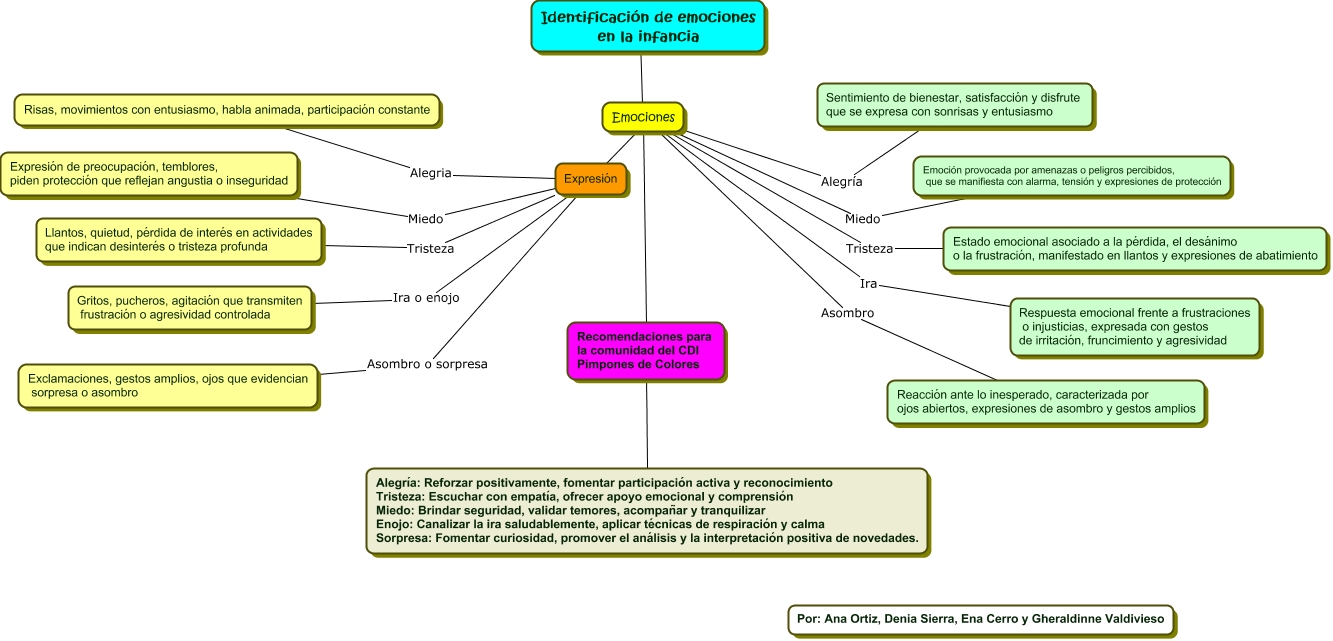 Este Cmap, tiene información relacionada con: SABER SENTIR 1, Emociones ???? Recomendaciones para la comunidad del CDI Pimpones de Colores, Recomendaciones para la comunidad del CDI Pimpones de Colores ???? Alegría: Reforzar positivamente, fomentar participación activa y reconocimiento Tristeza: Escuchar con empatía, ofrecer apoyo emocional y comprensión Miedo: Brindar seguridad, validar temores, acompañar y tranquilizar Enojo: Canalizar la ira saludablemente, aplicar técnicas de respiración y calma Sorpresa: Fomentar curiosidad, promover el análisis y la interpretación positiva de novedades., Emociones Asombro Reacción ante lo inesperado, caracterizada por ojos abiertos, expresiones de asombro y gestos amplios, Emociones ???? Expresión, Expresión Alegria Risas, movimientos con entusiasmo, habla animada, participación constante, Expresión Miedo Expresión de preocupación, temblores, piden protección que reflejan angustia o inseguridad, Expresión Ira o enojo Gritos, pucheros, agitación que transmiten frustración o agresividad controlada, Emociones Miedo Emoción provocada por amenazas o peligros percibidos, que se manifiesta con alarma, tensión y expresiones de protección, Expresión Tristeza Llantos, quietud, pérdida de interés en actividades que indican desinterés o tristeza profunda, Emociones Alegría Sentimiento de bienestar, satisfacción y disfrute que se expresa con sonrisas y entusiasmo, Emociones Ira Respuesta emocional frente a frustraciones o injusticias, expresada con gestos de irritación, fruncimiento y agresividad, Estado emocional asociado a la pérdida, el desánimo o la frustración, manifestado en llantos y expresiones de abatimiento Tristeza Emociones, Expresión Asombro o sorpresa Exclamaciones, gestos amplios, ojos que evidencian sorpresa o asombro, Identificación de emociones en la infancia ???? Emociones