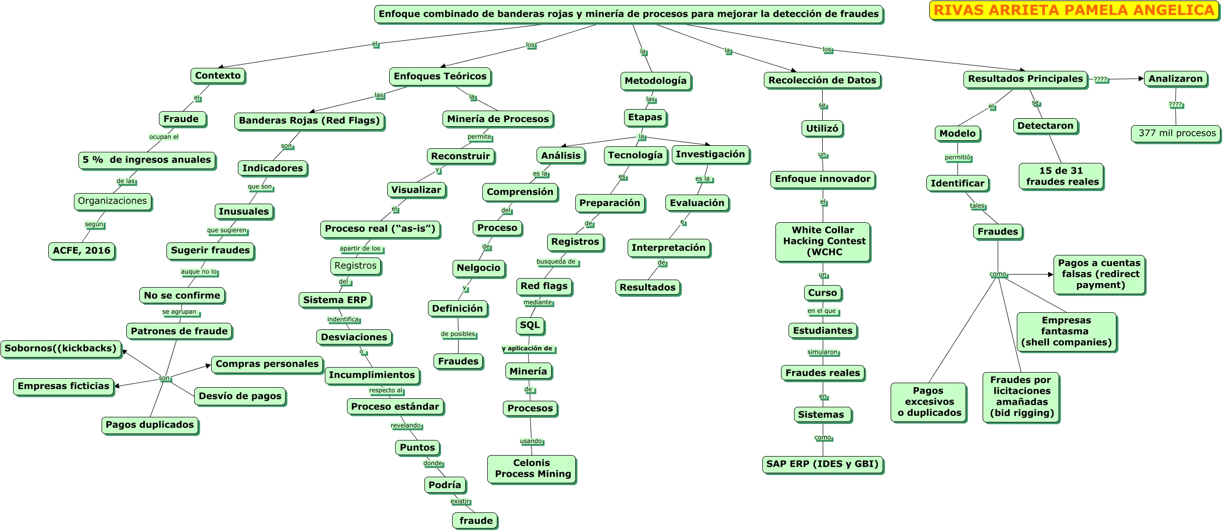 Este Cmap, tiene información relacionada con: BANDERAS, SQL y aplicación de Minería, 5 % de ingresos anuales de las Organizaciones, Etapas la Investigación, Minería de Procesos permite Reconstruir, Minería de Procesos, Proceso real (“as-is”) apartir de los Registros, Analizaron ???? 377 mil procesos, Registros del Sistema ERP, Utilizó un Enfoque innovador, Fraudes reales en Sistemas, Enfoque innovador el White Collar Hacking Contest (WCHC, Preparación de Registros, Análisis es la Comprensión, Recolección de Datos se Utilizó, Indicadores que son Inusuales, Enfoque combinado de banderas rojas y minería de procesos para mejorar la detección de fraudes la Metodología, Fraude ocupan el 5 % de ingresos anuales, Etapas la Tecnología, Red flags mediante SQL, Resultados Principales el Modelo