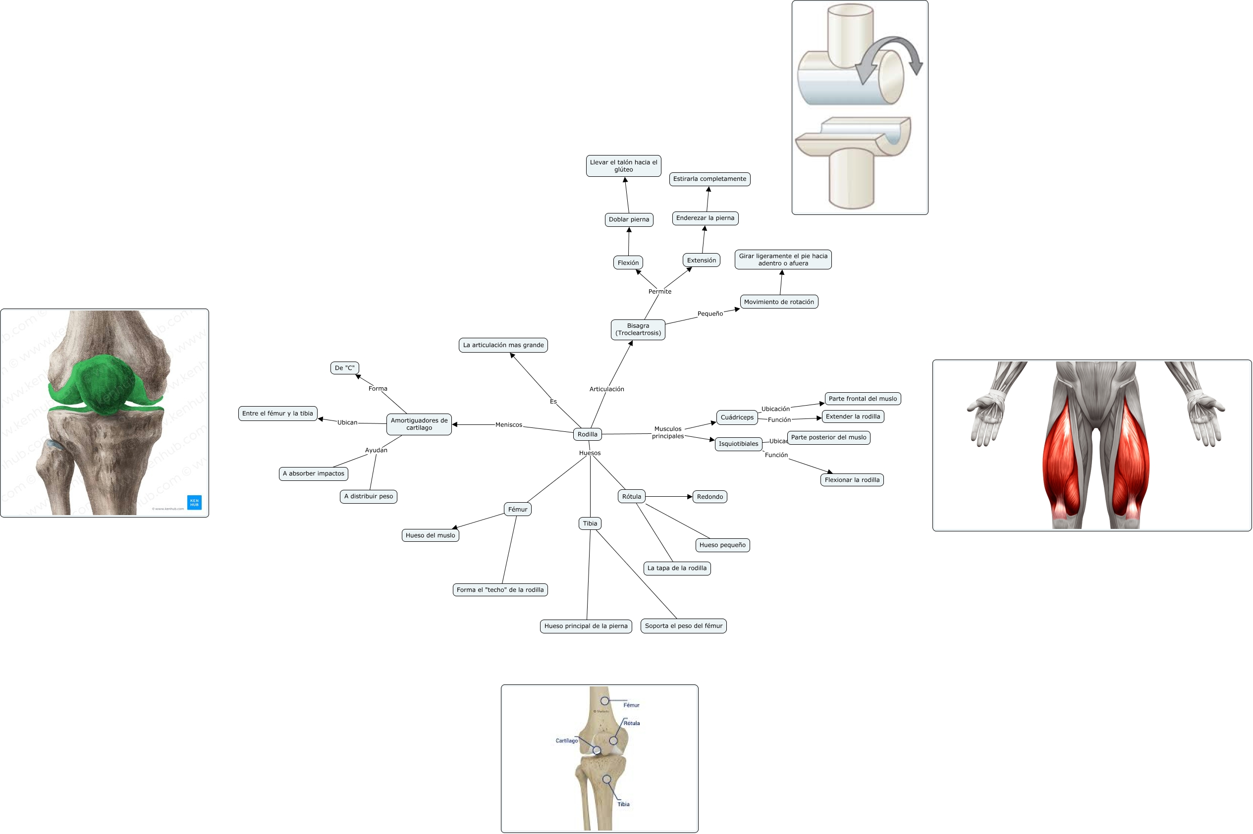Este Cmap, tiene información relacionada con: Rodillita mi kevin, Amortiguadores de cartilago Ayudan A distribuir peso, Rodilla Musculos principales Cuádriceps, Movimiento de rotación Girar ligeramente el pie hacia adentro o afuera, Isquiotibiales Función Flexionar la rodilla, Bisagra (Trocleartrosis) Pequeño Movimiento de rotación, Tibia Soporta el peso del fémur, Rodilla Huesos Fémur, Amortiguadores de cartilago Forma De "C", Amortiguadores de cartilago Ayudan A absorber impactos, Rodilla Huesos Rótula, Tibia Hueso principal de la pierna, Rodilla Es La articulación mas grande, Fémur Forma el "techo" de la rodilla, Cuádriceps Ubicación Parte frontal del muslo, Rótula La tapa de la rodilla, Rótula Redondo, Rodilla Musculos principales Isquiotibiales, Isquiotibiales Ubicación Parte posterior del muslo, Rodilla Huesos Tibia, Extensión Enderezar la pierna