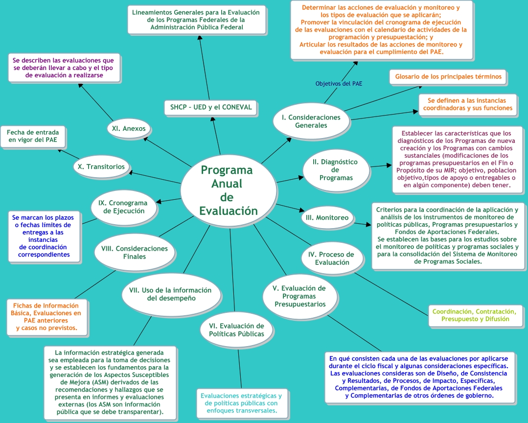 Este Cmap, tiene información relacionada con: Programa Anual de Evaluación, II. Diagnóstico de Programas ???? Establecer las características que los diagnósticos de los Programas de nueva creación y los Programas con cambios sustanciales (modificaciones de los programas presupuestarios en el Fin o Propósito de su MIR; objetivo, poblacion objetivo,tipos de apoyo o entregables o en algún componente) deben tener., I. Consideraciones Generales ???? Glosario de los principales términos, Programa Anual de Evaluación ???? V. Evaluación de Programas Presupuestarios, Programa Anual de Evaluación ???? VII. Uso de la información del desempeño, IX. Cronograma de Ejecución ???? Se marcan los plazos o fechas límites de entregas a las instancias de coordinación correspondientes, SHCP – UED y el CONEVAL ???? Lineamientos Generales para la Evaluación de los Programas Federales de la Administración Pública Federal, Programa Anual de Evaluación ???? I. Consideraciones Generales, Programa Anual de Evaluación ???? VIII. Consideraciones Finales, XI. Anexos ???? Se describen las evaluaciones que se deberán llevar a cabo y el tipo de evaluación a realizarse, VIII. Consideraciones Finales ???? Fichas de Información Básica, Evaluaciones en PAE anteriores y casos no previstos., Programa Anual de Evaluación ???? II. Diagnóstico de Programas, Programa Anual de Evaluación ???? SHCP – UED y el CONEVAL, I. Consideraciones Generales Objetivos del PAE Determinar las acciones de evaluación y monitoreo y los tipos de evaluación que se aplicarán; Promover la vinculación del cronograma de ejecución de las evaluaciones con el calendario de actividades de la programación y presupuestación; y Articular los resultados de las acciones de monitoreo y evaluación para el cumplimiento del PAE., Programa Anual de Evaluación ???? VI. Evaluación de Políticas Públicas, V. Evaluación de Programas Presupuestarios ???? En qué consisten cada una de las evaluaciones por aplicarse durante el ciclo fiscal y algunas consideraciones específicas. Las evaluaciones consideras son de Diseño, de Consistencia y Resultados, de Procesos, de Impacto, Específicas, Complementarias, de Fondos de Aportaciones Federales y Complementarias de otros órdenes de gobierno., III. Monitoreo ???? Criterios para la coordinación de la aplicación y análisis de los instrumentos de monitoreo de políticas públicas, Programas presupuestarios y Fondos de Aportaciones Federales. Se establecen las bases para los estudios sobre el monitoreo de políticas y programas sociales y para la consolidación del Sistema de Monitoreo de Programas Sociales., Programa Anual de Evaluación ???? III. Monitoreo, I. Consideraciones Generales ???? Se definen a las instancias coordinadoras y sus funciones, VI. Evaluación de Políticas Públicas ???? Evaluaciones estratégicas y de políticas públicas con enfoques transversales., X. Transitorios ???? Fecha de entrada en vigor del PAE