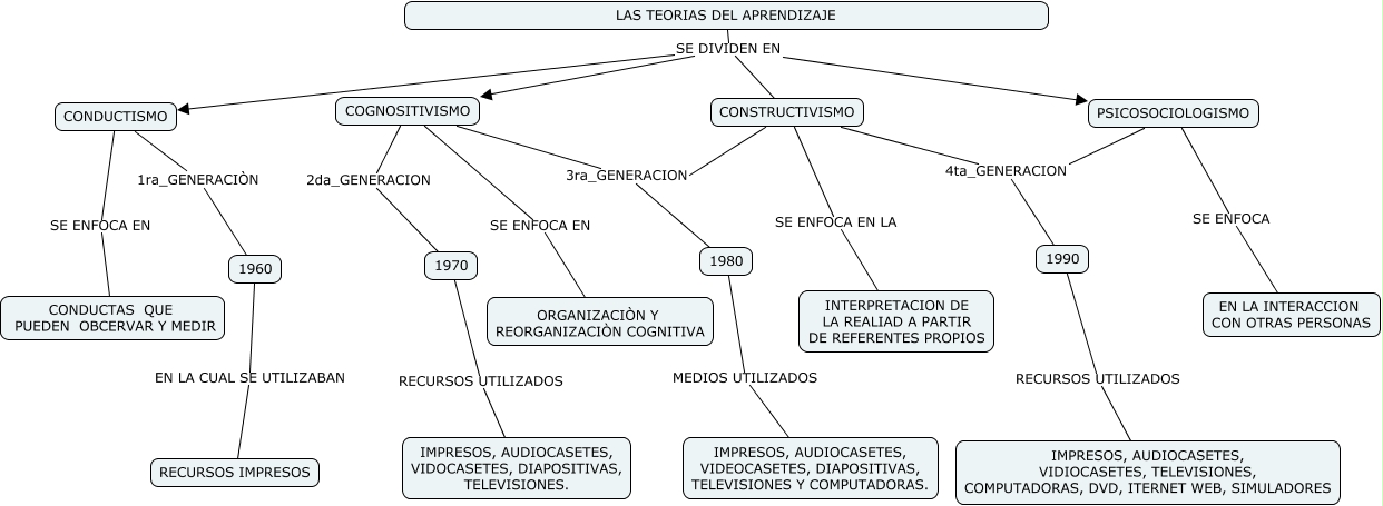 Este Cmap, tiene información relacionada con: Herrera_Paulo_Mapa conceptual, LAS TEORIAS DEL APRENDIZAJE SE DIVIDEN EN CONDUCTISMO, COGNOSITIVISMO 3ra_GENERACION 1980, CONSTRUCTIVISMO 3ra_GENERACION 1980, LAS TEORIAS DEL APRENDIZAJE SE DIVIDEN EN COGNOSITIVISMO, 1990 RECURSOS UTILIZADOS IMPRESOS, AUDIOCASETES, VIDIOCASETES, TELEVISIONES, COMPUTADORAS, DVD, ITERNET WEB, SIMULADORES, CONDUCTISMO 1ra_GENERACIÒN 1960, CONSTRUCTIVISMO SE ENFOCA EN LA INTERPRETACION DE LA REALIAD A PARTIR DE REFERENTES PROPIOS, 1960 EN LA CUAL SE UTILIZABAN RECURSOS IMPRESOS, PSICOSOCIOLOGISMO 4ta_GENERACION 1990, 1980 MEDIOS UTILIZADOS IMPRESOS, AUDIOCASETES, VIDEOCASETES, DIAPOSITIVAS, TELEVISIONES Y COMPUTADORAS., COGNOSITIVISMO SE ENFOCA EN ORGANIZACIÒN Y REORGANIZACIÒN COGNITIVA, CONSTRUCTIVISMO 4ta_GENERACION 1990, LAS TEORIAS DEL APRENDIZAJE SE DIVIDEN EN CONSTRUCTIVISMO, CONDUCTISMO SE ENFOCA EN CONDUCTAS QUE PUEDEN OBCERVAR Y MEDIR, 1970 RECURSOS UTILIZADOS IMPRESOS, AUDIOCASETES, VIDOCASETES, DIAPOSITIVAS, TELEVISIONES., COGNOSITIVISMO 2da_GENERACION 1970, LAS TEORIAS DEL APRENDIZAJE SE DIVIDEN EN PSICOSOCIOLOGISMO, PSICOSOCIOLOGISMO SE ENFOCA EN LA INTERACCION CON OTRAS PERSONAS
