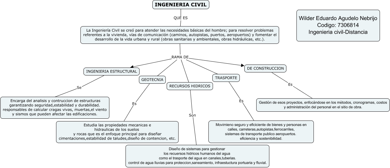 Este Cmap, tiene información relacionada con: INGENIERIA CIVIL, La Ingeniería Civil se creó para atender las necesidades básicas del hombre; para resolver problemas referentes a la vivienda, vías de comunicación (caminos, autopistas, puertos, aeropuertos) y fomentar el desarrollo de la vida urbana y rural (obras sanitarias y ambientales, obras hidráulicas, etc.). RAMA DE RECURSOS HIDRICOS, GEOTECNIA Es Estudia las propiedades mecanicas e hidraulicas de los suelos y rocas que es el enfoque principal para diseñar cimentaciones,estabilidad de taludes,diseño de contencion, etc., La Ingeniería Civil se creó para atender las necesidades básicas del hombre; para resolver problemas referentes a la vivienda, vías de comunicación (caminos, autopistas, puertos, aeropuertos) y fomentar el desarrollo de la vida urbana y rural (obras sanitarias y ambientales, obras hidráulicas, etc.). RAMA DE DE CONSTRUCCION, RECURSOS HIDRICOS Son Diseño de sistemas para gestionar los recuersos hidricos humanos del agua como el trasporte del agua en canales,tuberias. control de agua lluvias para proteccion,saneamiento, infraestuctura portuaria y fluvial., INGENIERIA ESTRUCTURAL Se Encarga del analisis y contruccion de estructuras garantizando seguridad,estabilidad y durabilidad. responsables de calcular cragas vivas, muertas,el viento y sismos que pueden afectar las edificaciones., La Ingeniería Civil se creó para atender las necesidades básicas del hombre; para resolver problemas referentes a la vivienda, vías de comunicación (caminos, autopistas, puertos, aeropuertos) y fomentar el desarrollo de la vida urbana y rural (obras sanitarias y ambientales, obras hidráulicas, etc.). RAMA DE INGENIERIA ESTRUCTURAL, La Ingeniería Civil se creó para atender las necesidades básicas del hombre; para resolver problemas referentes a la vivienda, vías de comunicación (caminos, autopistas, puertos, aeropuertos) y fomentar el desarrollo de la vida urbana y rural (obras sanitarias y ambientales, obras hidráulicas, etc.). RAMA DE TRASPORTE, DE CONSTRUCCION Es Gestión de esos proyectos, enfocándose en los métodos, cronogramas, costos y administración del personal en el sitio de obra., TRASPORTE Es Movimieno seguro y eficiciente de bienes y personas en calles, carreteras,autopistas,ferrocarriles, sistemas de transporte publico aeropuertos. eficiencia y sostenibilidad., INGENIERIA CIVIL QUE ES ????, La Ingeniería Civil se creó para atender las necesidades básicas del hombre; para resolver problemas referentes a la vivienda, vías de comunicación (caminos, autopistas, puertos, aeropuertos) y fomentar el desarrollo de la vida urbana y rural (obras sanitarias y ambientales, obras hidráulicas, etc.). RAMA DE GEOTECNIA