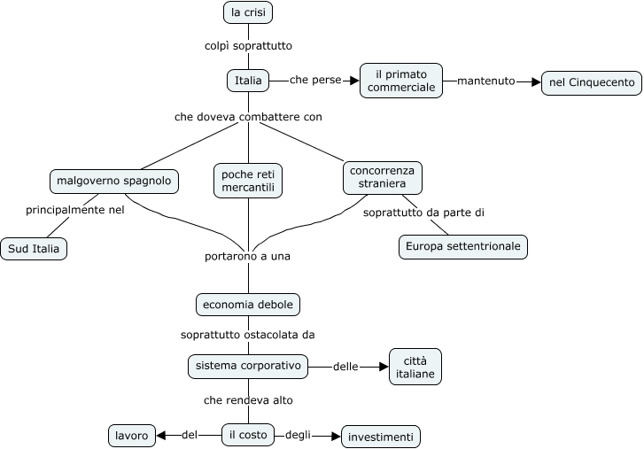 Questa Cmap, creata con IHMC CmapTools, contiene informazioni relative a: Declino del primato italiano XVII sec, Italia che doveva combattere con malgoverno spagnolo, sistema corporativo che rendeva alto il costo, concorrenza straniera soprattutto da parte di Europa settentrionale, malgoverno spagnolo portarono a una economia debole, Italia che doveva combattere con concorrenza straniera, Italia che perse il primato commerciale, Italia che doveva combattere con poche reti mercantili, il primato commerciale mantenuto nel Cinquecento, il costo del lavoro, poche reti mercantili portarono a una economia debole, il costo degli investimenti, concorrenza straniera portarono a una economia debole, economia debole soprattutto ostacolata da sistema corporativo, la crisi colpì soprattutto Italia, malgoverno spagnolo principalmente nel Sud Italia, sistema corporativo delle città italiane