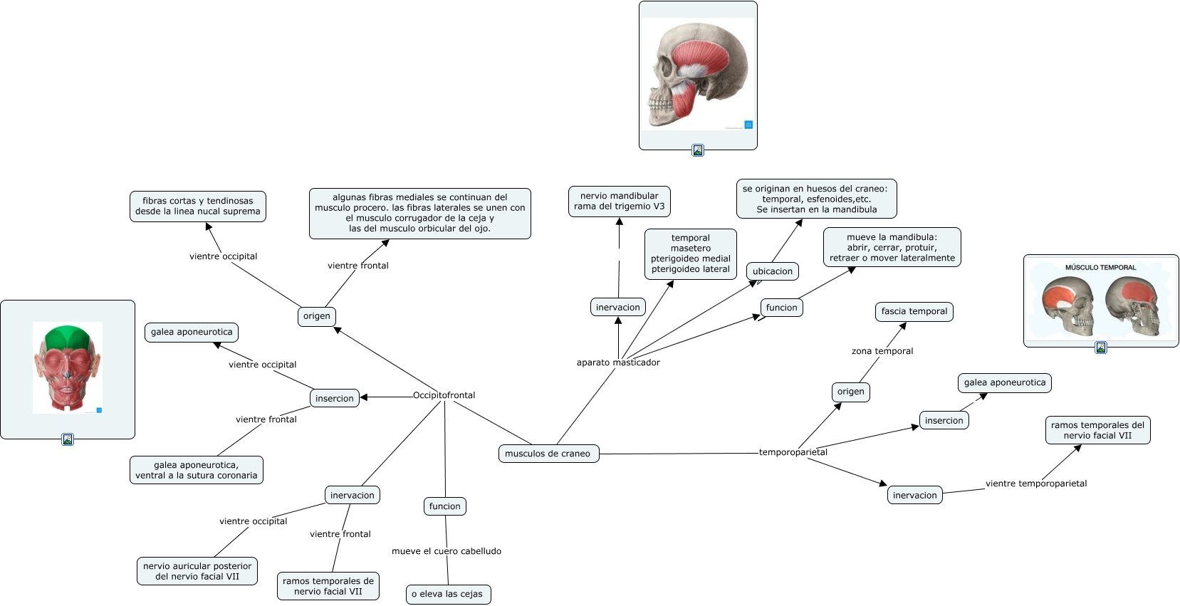 Este Cmap, tiene información relacionada con: musculos craneo ale, musculos de craneo aparato masticador funcion, musculos de craneo temporoparietal origen, musculos de craneo aparato masticador temporal masetero pterigoideo medial pterigoideo lateral, musculos de craneo Occipitofrontal funcion, musculos de craneo temporoparietal insercion, inervacion vientre temporoparietal ramos temporales del nervio facial VII, musculos de craneo temporoparietal inervacion, origen zona temporal fascia temporal, musculos de craneo Occipitofrontal insercion, origen vientre frontal algunas fibras mediales se continuan del musculo procero. las fibras laterales se unen con el musculo corrugador de la ceja y las del musculo orbicular del ojo., inervacion vientre occipital nervio auricular posterior del nervio facial VII, inervacion nervio mandibular rama del trigemio V3, ubicacion se originan en huesos del craneo: temporal, esfenoides,etc. Se insertan en la mandibula, insercion galea aponeurotica, musculos de craneo Occipitofrontal inervacion, inervacion vientre frontal ramos temporales de nervio facial VII, insercion vientre occipital galea aponeurotica, funcion mueve la mandibula: abrir, cerrar, protuir, retraer o mover lateralmente, musculos de craneo aparato masticador inervacion, funcion mueve el cuero cabelludo o eleva las cejas