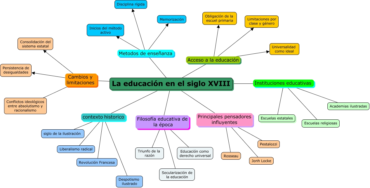 Este Cmap, tiene información relacionada con: La educación en el siglo 18, La educación en el siglo XVIII Cambios y limitaciones Conflictos ideológicos entre absolutismo y racionalismo, La educación en el siglo XVIII contexto historico Despotismo ilustrado, La educación en el siglo XVIII contexto historico siglo de la ilustración, La educación en el siglo XVIII Metodos de enseñanza Inicios del método activo, La educación en el siglo XVIII Acceso a la educación Limitaciones por clase y género, La educación en el siglo XVIII Metodos de enseñanza Disciplina rígida, La educación en el siglo XVIII Principales pensadores influyentes Jonh Locke, La educación en el siglo XVIII contexto historico Revolución Francesa, La educación en el siglo XVIII Filosofía educativa de la época Educación como derecho universal, La educación en el siglo XVIII Acceso a la educación Universalidad como ideal, La educación en el siglo XVIII Cambios y limitaciones Consolidación del sistema estatal, La educación en el siglo XVIII contexto historico Liberalismo radical, La educación en el siglo XVIII Cambios y limitaciones Persistencia de desigualdades, La educación en el siglo XVIII Instituciones educativas Escuelas religiosas, La educación en el siglo XVIII Filosofía educativa de la época Secularización de la educación, La educación en el siglo XVIII Acceso a la educación Obligación de la escuel primaria, La educación en el siglo XVIII Principales pensadores influyentes Pestalozzi, La educación en el siglo XVIII Instituciones educativas Escuelas estatales, La educación en el siglo XVIII Instituciones educativas Academias ilustradas, La educación en el siglo XVIII Principales pensadores influyentes Rosseau