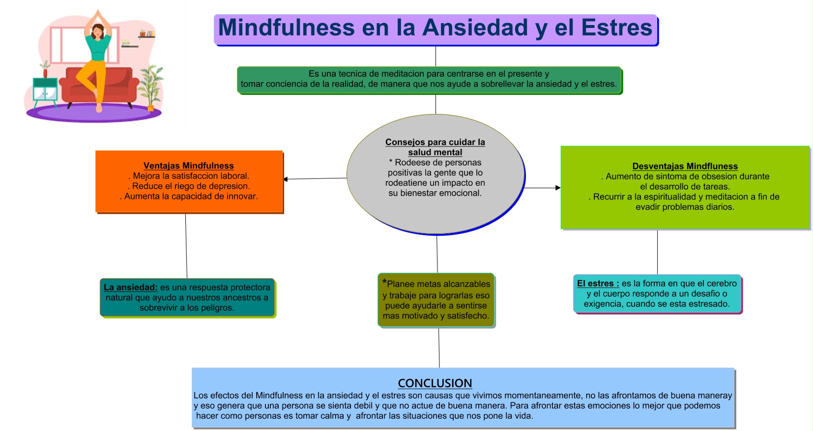 Este Cmap, tiene información relacionada con: Minfulness en la Ansiedad y el Estres, Desventajas Mindfluness . Aumento de sintoma de obsesion durante el desarrollo de tareas. . Recurrir a la espiritualidad y meditacion a fin de evadir problemas diarios. ???? El estres : es la forma en que el cerebro y el cuerpo responde a un desafio o exigencia, cuando se esta estresado., Mindfulness en la Ansiedad y el Estres ???? Consejos para cuidar la salud mental * Rodeese de personas positivas la gente que lo rodeatiene un impacto en su bienestar emocional., Consejos para cuidar la salud mental * Rodeese de personas positivas la gente que lo rodeatiene un impacto en su bienestar emocional. ???? Ventajas Mindfulness . Mejora la satisfaccion laboral. . Reduce el riego de depresion. . Aumenta la capacidad de innovar., Consejos para cuidar la salud mental * Rodeese de personas positivas la gente que lo rodeatiene un impacto en su bienestar emocional. ???? CONCLUSION Los efectos del Mindfulness en la ansiedad y el estres son causas que vivimos momentaneamente, no las afrontamos de buena maneray y eso genera que una persona se sienta debil y que no actue de buena manera. Para afrontar estas emociones lo mejor que podemos hacer como personas es tomar calma y afrontar las situaciones que nos pone la vida., Ventajas Mindfulness . Mejora la satisfaccion laboral. . Reduce el riego de depresion. . Aumenta la capacidad de innovar. ???? La ansiedad: es una respuesta protectora natural que ayudo a nuestros ancestros a sobrevivir a los peligros., Consejos para cuidar la salud mental * Rodeese de personas positivas la gente que lo rodeatiene un impacto en su bienestar emocional. ???? Desventajas Mindfluness . Aumento de sintoma de obsesion durante el desarrollo de tareas. . Recurrir a la espiritualidad y meditacion a fin de evadir problemas diarios.