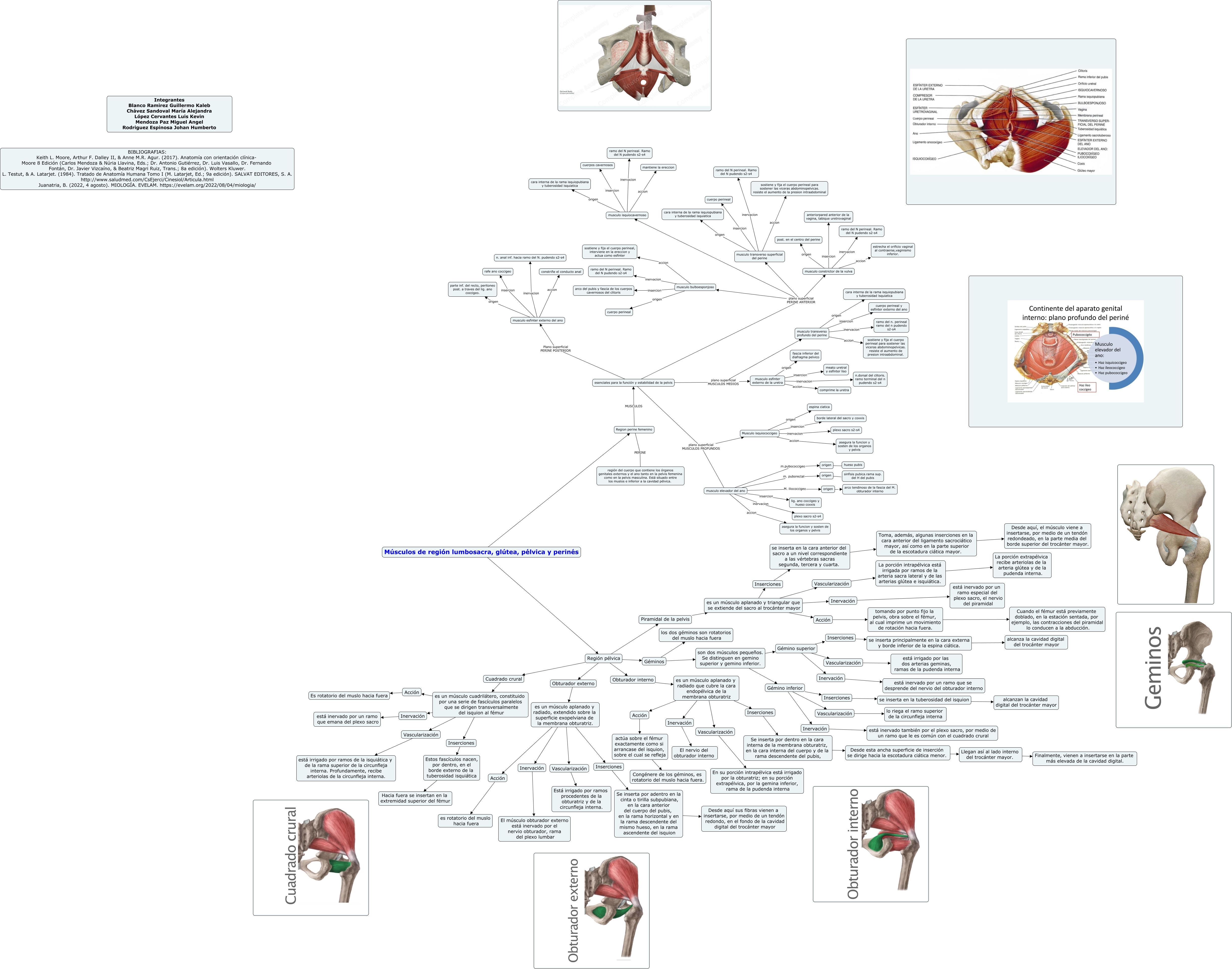 Este Cmap, tiene información relacionada con: Músculos de región lumbosacra, glútea, pélvica y perinés 2, Llegan así al lado interno del trocánter mayor. Finalmente, vienen a insertarse en la parte más elevada de la cavidad digital., Vascularización En su porción intrapélvica está irrigado por la obturatriz; en su porción extrapélvica, por la gemina inferior, rama de la pudenda interna, se inserta en la tuberosidad del isquion alcanzan la cavidad digital del trocánter mayor, Inserciones se inserta en la tuberosidad del isquion, es un músculo aplanado y triangular que se extiende del sacro al trocánter mayor Acción, musculo constrictor de la vulva accion estrecha el orificio vaginal al contraerse,vaginismo inferior., tomando por punto fijo la pelvis, obra sobre el fémur, al cual imprime un movimiento de rotación hacia fuera. Cuando el fémur está previamente doblado, en la estación sentada, por ejemplo, las contracciones del piramidal lo conducen a la abducción., esenciales para la función y estabilidad de la pelvis Plano superficial PERINE POSTERIOR musculo esfinter externo del ano, musculo bulboesponjoso accion sostiene y fija el cuerpo perineal, interviene en la ereccion y actua como esfinter, es un músculo aplanado y radiado que cubre la cara endopélvica de la membrana obturatriz Vascularización, Inervación El músculo obturador externo está inervado por el nervio obturador, rama del plexo lumbar, es un músculo cuadrilátero, constituido por una serie de fascículos paralelos que se dirigen transversalmente del isquion al fémur Acción, Géminos los dos géminos son rotatorios del muslo hacia fuera, musculo isquiocavernoso insercion cuerpos cavernosos, actúa sobre el fémur exactamente como si arrancase del isquion, sobre el cual se refleja Congénere de los géminos, es rotatorio del muslo hacia fuera., Musculo isquiococcigeo accion asegura la funcion y sosten de los organos y pelvis, Acción tomando por punto fijo la pelvis, obra sobre el fémur, al cual imprime un movimiento de rotación hacia fuera., es un músculo aplanado y radiado, extendido sobre la superficie exopelviana de la membrana obturatriz. Vascularización, Vascularización Está irrigado por ramos procedentes de la obturatriz y de la circunfleja interna., musculo transverso profundo del perine origen cara interna de la rama isquiopubiana y tuberosidad isquiatica