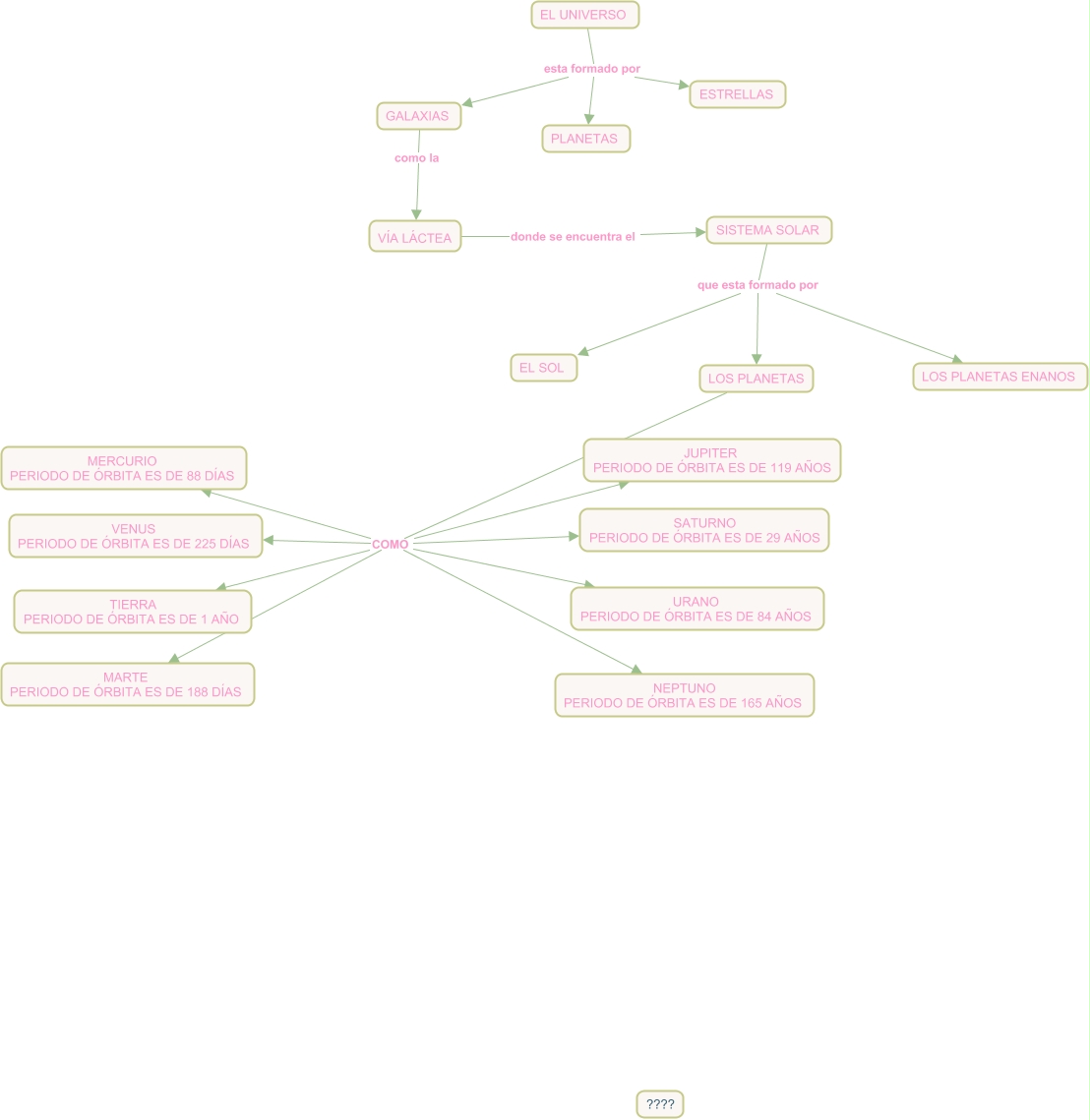Este Cmap, tiene información relacionada con: EL UNIVERSO, SISTEMA SOLAR que esta formado por EL SOL, LOS PLANETAS COMO SATURNO PERIODO DE ÓRBITA ES DE 29 AÑOS, LOS PLANETAS COMO JUPITER PERIODO DE ÓRBITA ES DE 119 AÑOS, EL UNIVERSO esta formado por PLANETAS, GALAXIAS como la VÍA LÁCTEA, LOS PLANETAS COMO URANO PERIODO DE ÓRBITA ES DE 84 AÑOS, LOS PLANETAS COMO MARTE PERIODO DE ÓRBITA ES DE 188 DÍAS, LOS PLANETAS COMO NEPTUNO PERIODO DE ÓRBITA ES DE 165 AÑOS, VÍA LÁCTEA donde se encuentra el SISTEMA SOLAR, EL UNIVERSO esta formado por ESTRELLAS, EL UNIVERSO esta formado por GALAXIAS, LOS PLANETAS COMO VENUS PERIODO DE ÓRBITA ES DE 225 DÍAS, LOS PLANETAS COMO TIERRA PERIODO DE ÓRBITA ES DE 1 AÑO, LOS PLANETAS COMO MERCURIO PERIODO DE ÓRBITA ES DE 88 DÍAS, SISTEMA SOLAR que esta formado por LOS PLANETAS, SISTEMA SOLAR que esta formado por LOS PLANETAS ENANOS