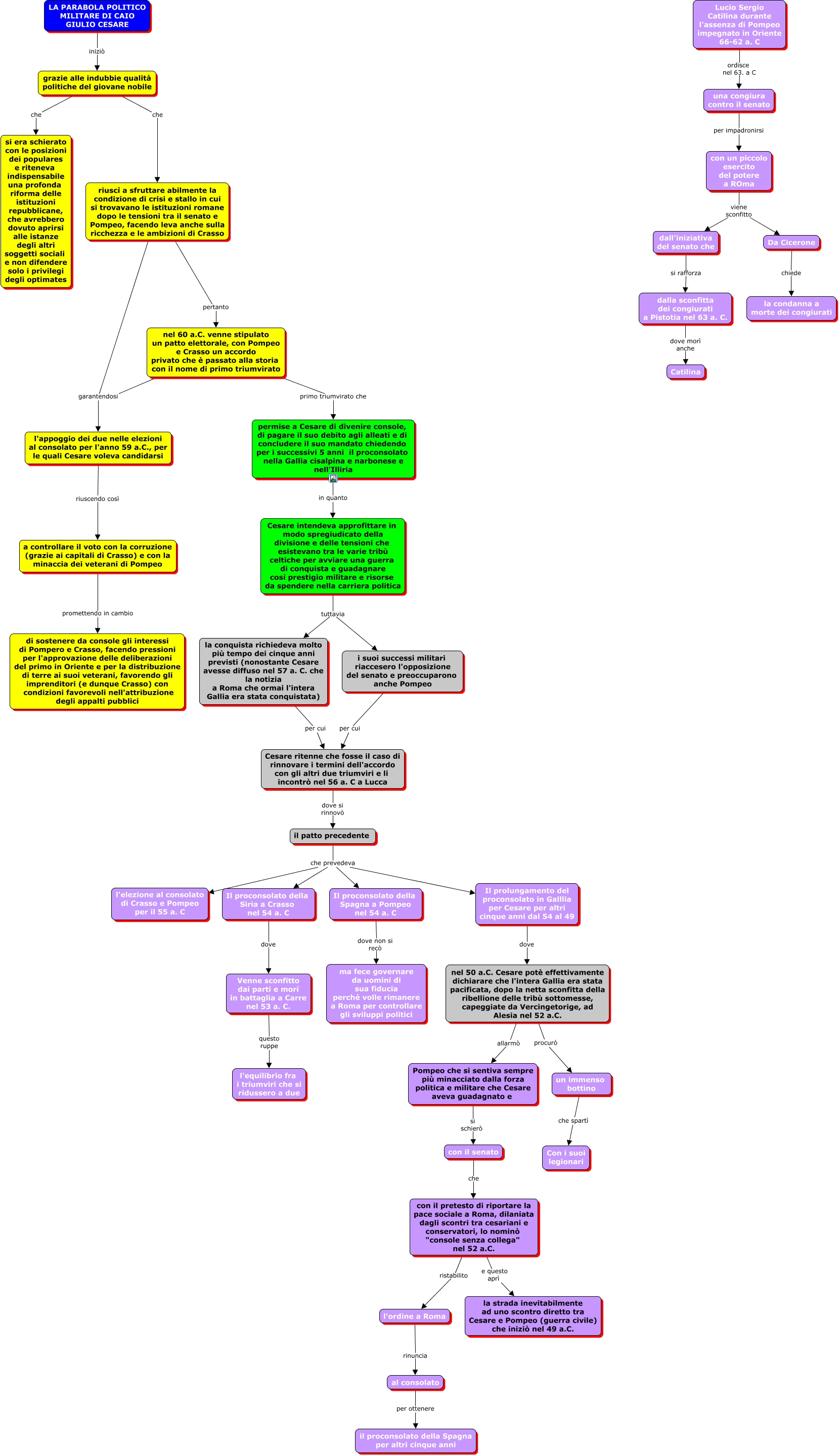 Questa Cmap, creata con IHMC CmapTools, contiene informazioni relative a: Ascesa di Cesare, l'appoggio dei due nelle elezioni al consolato per l'anno 59 a.C., per le quali Cesare voleva candidarsi riuscendo così a controllare il voto con la corruzione (grazie ai capitali di Crasso) e con la minaccia dei veterani di Pompeo, Cesare ritenne che fosse il caso di rinnovare i termini dell'accordo con gli altri due triumviri e li incontrò nel 56 a. C a Lucca dove si rinnovò il patto precedente, Il prolungamento del proconsolato in Galllia per Cesare per altri cinque anni dal 54 al 49 dove nel 50 a.C. Cesare potè effettivamente dichiarare che l'intera Gallia era stata pacificata, dopo la netta sconfitta della ribellione delle tribù sottomesse, capeggiate da Vercingetorige, ad Alesia nel 52 a.C., Venne sconfitto dai parti e morì in battaglia a Carre nel 53 a. C. questo ruppe l'equilibrio fra i triumviri che si ridussero a due, dall'iniziativa del senato che si rafforza dalla sconfitta dei congiurati a Pistotia nel 63 a. C., con il senato che con il pretesto di riportare la pace sociale a Roma, dilaniata dagli scontri tra cesariani e conservatori, lo nominò "console senza collega" nel 52 a.C., il patto precedente che prevedeva Il proconsolato della Spagna a Pompeo nel 54 a. C, una congiura contro il senato per impadronirsi con un piccolo esercito del potere a ROma, dalla sconfitta dei congiurati a Pistotia nel 63 a. C. dove morì anche Catilina, Il proconsolato della Siria a Crasso nel 54 a. C dove Venne sconfitto dai parti e morì in battaglia a Carre nel 53 a. C., con un piccolo esercito del potere a ROma viene sconfitto Da Cicerone, permise a Cesare di divenire console, di pagare il suo debito agli alleati e di concludere il suo mandato chiedendo per i successivi 5 anni il proconsolato nella Gallia cisalpina e narbonese e nell'Illiria in quanto Cesare intendeva approfittare in modo spregiudicato della divisione e delle tensioni che esistevano tra le varie tribù celtiche per avviare una guerra di conquista e guadagnare così prestigio militare e risorse da spendere nella carriera politica, il patto precedente che prevedeva Il proconsolato della Siria a Crasso nel 54 a. C, con il pretesto di riportare la pace sociale a Roma, dilaniata dagli scontri tra cesariani e conservatori, lo nominò "console senza collega" nel 52 a.C. ristabilito l'ordine a Roma, al consolato per ottenere il proconsolato della Spagna per altri cinque anni, Lucio Sergio Catilina durante l'assenza di Pompeo impegnato in Oriente 66-62 a. C ordisce nel 63. a C una congiura contro il senato, a controllare il voto con la corruzione (grazie ai capitali di Crasso) e con la minaccia dei veterani di Pompeo promettendo in cambio di sostenere da console gli interessi di Pompero e Crasso, facendo pressioni per l'approvazione delle deliberazioni del primo in Oriente e per la distribuzione di terre ai suoi veterani, favorendo gli imprenditori (e dunque Crasso) con condizioni favorevoli nell'attribuzione degli appalti pubblici, Il proconsolato della Spagna a Pompeo nel 54 a. C dove non si recò ma fece governare da uomini di sua fiducia perchè volle rimanere a Roma per controllare gli sviluppi politici, nel 60 a.C. venne stipulato un patto elettorale, con Pompeo e Crasso un accordo privato che è passato alla storia con il nome di primo triumvirato primo triumvirato che permise a Cesare di divenire console, di pagare il suo debito agli alleati e di concludere il suo mandato chiedendo per i successivi 5 anni il proconsolato nella Gallia cisalpina e narbonese e nell'Illiria, nel 60 a.C. venne stipulato un patto elettorale, con Pompeo e Crasso un accordo privato che è passato alla storia con il nome di primo triumvirato garantendosi l'appoggio dei due nelle elezioni al consolato per l'anno 59 a.C., per le quali Cesare voleva candidarsi