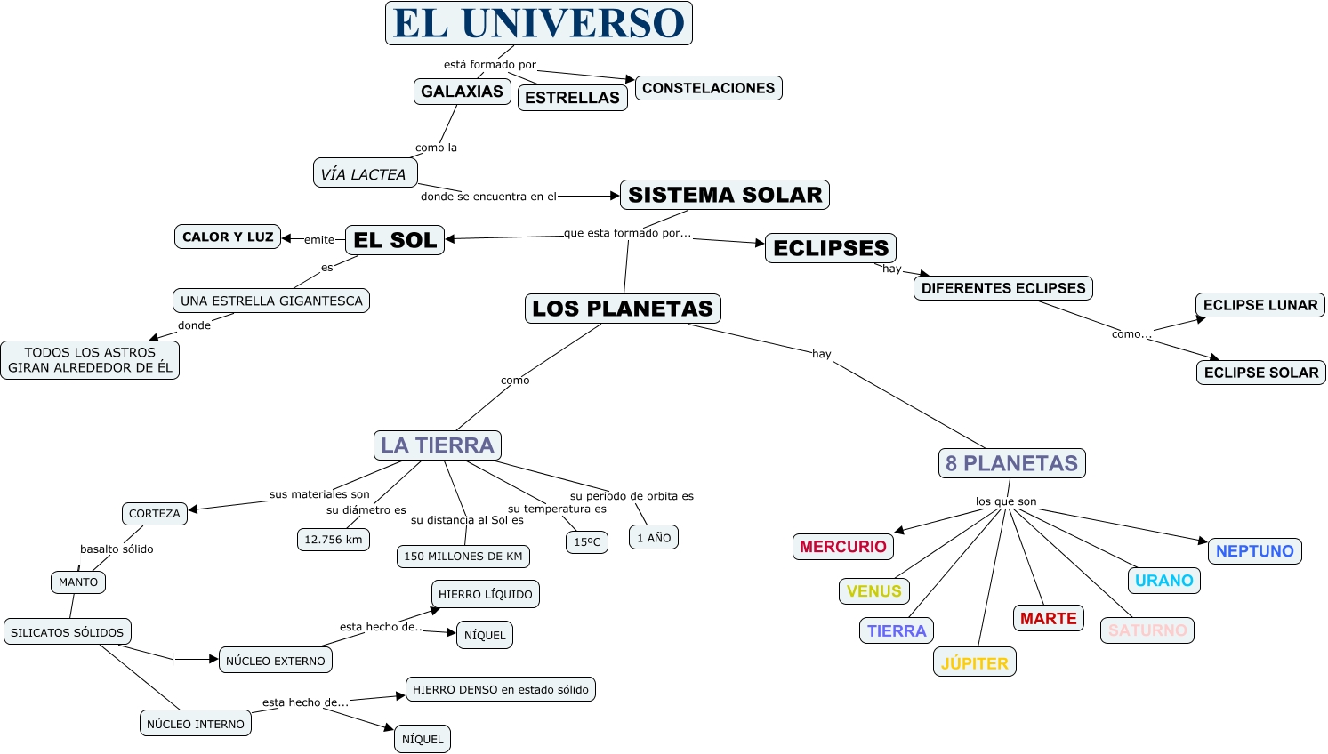 Este Cmap, tiene información relacionada con: el universo por matei de y eloy de 6º, LA TIERRA su diámetro es 12.756 km, LA TIERRA sus materiales son CORTEZA, NÚCLEO EXTERNO esta hecho de.. HIERRO LÍQUIDO, EL SOL es UNA ESTRELLA GIGANTESCA, VÍA LACTEA donde se encuentra en el SISTEMA SOLAR, MANTO SILICATOS SÓLIDOS, ECLIPSES hay DIFERENTES ECLIPSES, CORTEZA basalto sólido MANTO, SILICATOS SÓLIDOS NÚCLEO EXTERNO, DIFERENTES ECLIPSES como... ECLIPSE LUNAR, 8 PLANETAS los que son SATURNO, NÚCLEO EXTERNO esta hecho de.. NÍQUEL, 8 PLANETAS los que son NEPTUNO, 8 PLANETAS los que son URANO, SISTEMA SOLAR que esta formado por... ECLIPSES, GALAXIAS como la VÍA LACTEA, EL UNIVERSO está formado por CONSTELACIONES, EL SOL emite CALOR Y LUZ, DIFERENTES ECLIPSES como... ECLIPSE SOLAR, LA TIERRA su temperatura es 15ºC