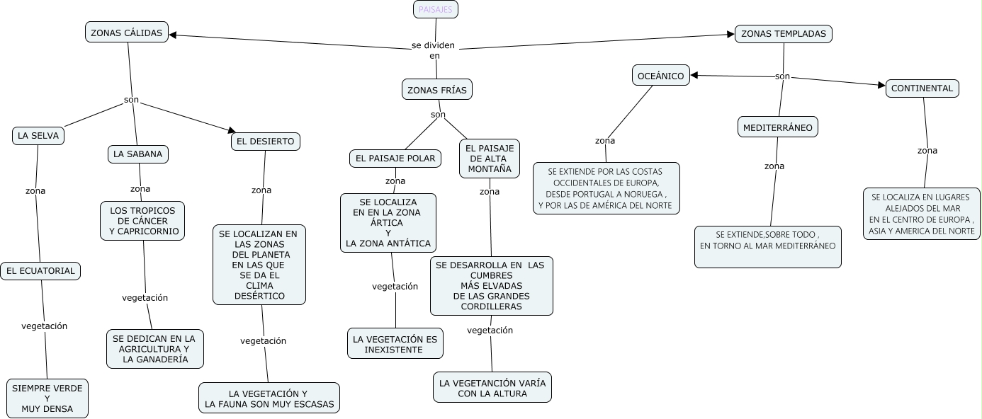Este Cmap, tiene información relacionada con: PAISSAJES DE LA TIERRA SHEYLA Y AINARA, MEDITERRÁNEO zona SE EXTIENDE,SOBRE TODO , EN TORNO AL MAR MEDITERRÁNEO, ZONAS FRÍAS son EL PAISAJE DE ALTA MONTAÑA, EL PAISAJE DE ALTA MONTAÑA zona SE DESARROLLA EN LAS CUMBRES MÁS ELVADAS DE LAS GRANDES CORDILLERAS, PAISAJES se dividen en ZONAS TEMPLADAS, ZONAS TEMPLADAS son MEDITERRÁNEO, LOS TROPICOS DE CÁNCER Y CAPRICORNIO vegetación SE DEDICAN EN LA AGRICULTURA Y LA GANADERÍA, ZONAS CÁLIDAS son EL DESIERTO, LA SABANA zona LOS TROPICOS DE CÁNCER Y CAPRICORNIO, PAISAJES se dividen en ZONAS CÁLIDAS, ZONAS FRÍAS son EL PAISAJE POLAR, EL DESIERTO zona SE LOCALIZAN EN LAS ZONAS DEL PLANETA EN LAS QUE SE DA EL CLIMA DESÉRTICO, LA SELVA zona EL ECUATORIAL, SE LOCALIZA EN EN LA ZONA ÁRTICA Y LA ZONA ANTÁTICA vegetación LA VEGETACIÓN ES INEXISTENTE, EL ECUATORIAL vegetación SIEMPRE VERDE Y MUY DENSA, ZONAS TEMPLADAS son CONTINENTAL, PAISAJES se dividen en ZONAS FRÍAS, ZONAS CÁLIDAS son LA SELVA, CONTINENTAL zona SE LOCALIZA EN LUGARES ALEJADOS DEL MAR EN EL CENTRO DE EUROPA , ASIA Y AMERICA DEL NORTE, EL PAISAJE POLAR zona SE LOCALIZA EN EN LA ZONA ÁRTICA Y LA ZONA ANTÁTICA, ZONAS CÁLIDAS son LA SABANA