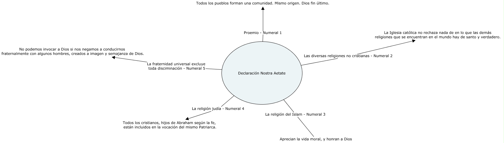 Este Cmap, tiene información relacionada con: Nostra Aetate, Declaración Nostra Aetate Las diversas religiones no cristianas - Numeral 2 La Iglesia católica no rechaza nada de en lo que las demás religiones que se encuentran en el mundo hay de santo y verdadero., Declaración Nostra Aetate La fraternidad universal excluye toda disciminación - Numeral 5 No podemos invocar a Dios si nos negamos a conducirnos fraternalmente con algunos hombres, creados a imagen y semajanza de Dios., Declaración Nostra Aetate La religión del Islam - Numeral 3 Aprecian la vida moral, y honran a Dios, Declaración Nostra Aetate Proemio - Numeral 1 Todos los pueblos forman una comunidad. Mismo origen. Dios fin último., Declaración Nostra Aetate La religión judía - Numeral 4 Todos los cristianos, hijos de Abraham según la fe, están incluidos en la vocación del mismo Patriarca.