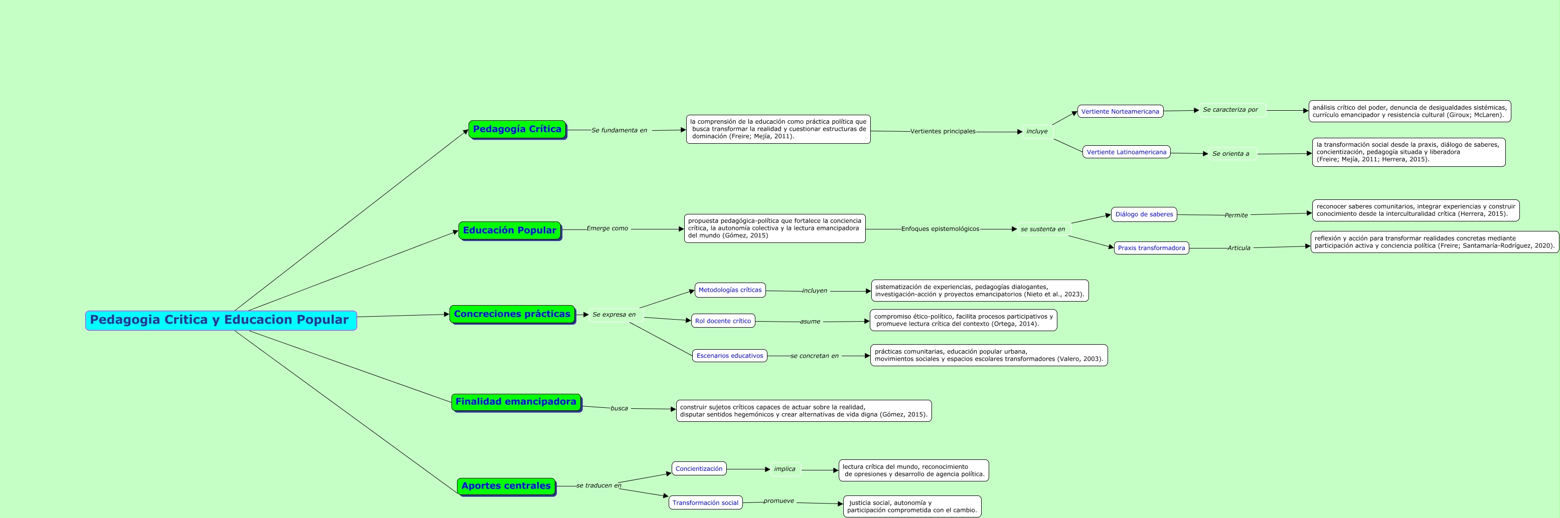 Este Cmap, tiene información relacionada con: ACTIVIDAD 6 PEDAGOGIA CRITICA .PARA SOCIALIZAR, Se expresa en Escenarios educativos, Pedagogia Critica y Educacion Popular Concreciones prácticas, Pedagogía Crítica Se fundamenta en la comprensión de la educación como práctica política que busca transformar la realidad y cuestionar estructuras de dominación (Freire; Mejía, 2011)., Se expresa en Metodologías críticas, Concreciones prácticas Se expresa en, Aportes centrales se traducen en Concientización, la comprensión de la educación como práctica política que busca transformar la realidad y cuestionar estructuras de dominación (Freire; Mejía, 2011). Vertientes principales incluye, Diálogo de saberes Permite reconocer saberes comunitarios, integrar experiencias y construir conocimiento desde la interculturalidad crítica (Herrera, 2015)., incluye Vertiente Norteamericana, incluye Vertiente Latinoamericana, implica lectura crítica del mundo, reconocimiento de opresiones y desarrollo de agencia política., Concientización implica, Se caracteriza por análisis crítico del poder, denuncia de desigualdades sistémicas, currículo emancipador y resistencia cultural (Giroux; McLaren)., Pedagogia Critica y Educacion Popular Aportes centrales, Pedagogia Critica y Educacion Popular Finalidad emancipadora, Se orienta a la transformación social desde la praxis, diálogo de saberes, concientización, pedagogía situada y liberadora (Freire; Mejía, 2011; Herrera, 2015)., Vertiente Latinoamericana Se orienta a, Escenarios educativos se concretan en prácticas comunitarias, educación popular urbana, movimientos sociales y espacios escolares transformadores (Valero, 2003)., Aportes centrales se traducen en Transformación social, propuesta pedagógica-política que fortalece la conciencia crítica, la autonomía colectiva y la lectura emancipadora del mundo (Gómez, 2015) Enfoques epistemológicos se sustenta en