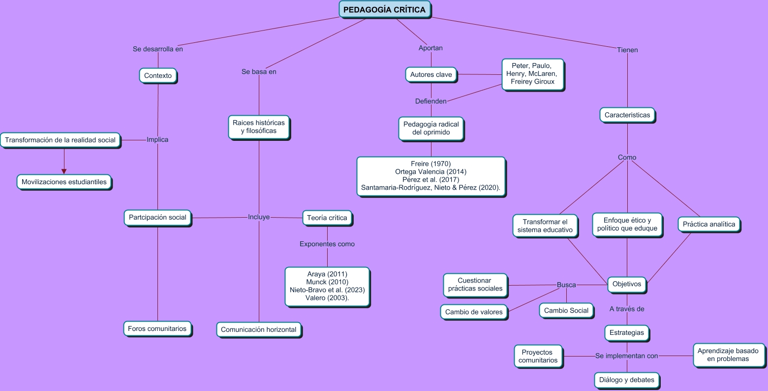 Este Cmap, tiene información relacionada con: Pedagogía crítica, Contexto Implica Partcipación social, Objetivos Busca Cambio Social, PEDAGOGÍA CRÍTICA Tienen Caracteristicas, Enfoque ético y político que eduque ???? Objetivos, Transformación de la realidad social ???? Movilizaciones estudiantiles, Partcipación social ???? Foros comunitarios, Autores clave ???? Peter, Paulo, Henry, McLaren, Freirey Giroux, PEDAGOGÍA CRÍTICA Se desarrolla en Contexto, Objetivos Busca Cambio de valores, Contexto Implica Transformación de la realidad social, Raices históricas y filosóficas Incluye Teoría crítica, Pedagogía radical del oprimido ???? Freire (1970) Ortega Valencia (2014) Pérez et al. (2017) Santamaria-Rodríguez, Nieto & Pérez (2020)., Raices históricas y filosóficas Incluye Partcipación social, Teoría crítica Exponentes como Araya (2011) Munck (2010) Nieto-Bravo et al. (2023) Valero (2003)., Estrategias Se implementan con Aprendizaje basado en problemas, Práctica analítica ???? Objetivos, Autores clave Defienden Pedagogía radical del oprimido, Caracteristicas Como Enfoque ético y político que eduque, PEDAGOGÍA CRÍTICA Se basa en Raices históricas y filosóficas, Objetivos A través de Estrategias