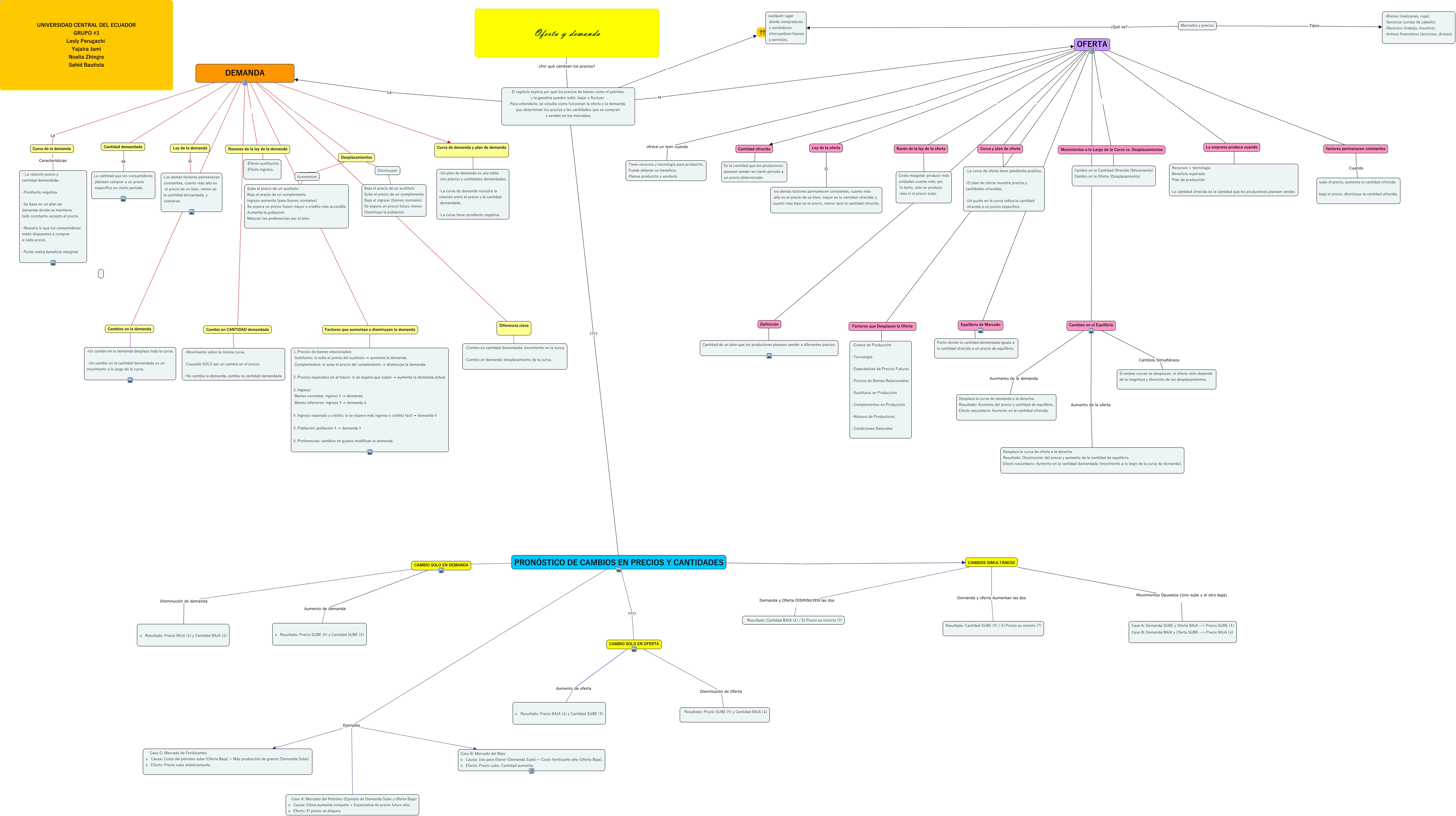Este Cmap, tiene información relacionada con: GRUPO3_MAPA_MICROECONOMIA_IMPAR3, Cambios en el Equilibrio Cambios Simultáneos Si ambas curvas se desplazan, el efecto neto depende de la magnitud y dirección de los desplazamientos., Razones de la ley de la demanda -Efecto sustitución -Efecto ingreso., Equilibrio de Mercado ???? Punto donde la cantidad demandada iguala a la cantidad ofrecida a un precio de equilibrio., Mercados y precios ¿Qué es? cualquier lugar donde compradores y vendedores intercambian bienes y servicios., Curva y plan de oferta ???? -La curva de oferta tiene pendiente positiva. -El plan de oferta muestra precios y cantidades ofrecidas. -Un punto en la curva indica la cantidad ofrecida a un precio específico., OFERTA ???? Equilibrio de Mercado, Curva de demanda y plan de demanda ???? -Un plan de demanda es una tabla con precios y cantidades demandadas. -La curva de demanda muestra la relación entre el precio y la cantidad demandada. -La curva tiene pendiente negativa., factores permanecen constantes Cuando sube el precio, aumenta la cantidad ofrecida. baja el precio, disminuye la cantidad ofrecida., El capítulo explica por qué los precios de bienes como el petróleo y la gasolina pueden subir, bajar o fluctuar. Para entenderlo, se estudia cómo funcionan la oferta y la demanda, que determinan los precios y las cantidades que se compran y venden en los mercados. La DEMANDA, CAMBIOS SIMULTÁNEOS Demanda y oferta Aumentan las dos Resultado: Cantidad SUBE (↑) / El Precio es incierto (?), DEMANDA Curva de demanda y plan de demanda, Desplazamientos ???? Aunmentan, DEMANDA ???? Cambios en la demanda, CAMBIO SOLO EN OFERTA Disminución de Oferta Resultado: Precio SUBE (↑) y Cantidad BAJA (↓), PRONÓSTICO DE CAMBIOS EN PRECIOS Y CANTIDADES ???? CAMBIO SOLO EN OFERTA, CAMBIOS SIMULTÁNEOS Movimientos Opuestos (Uno sube y el otro baja) Caso A: Demanda SUBE y Oferta BAJA --> Precio SUBE (↑) Caso B: Demanda BAJA y Oferta SUBE --> Precio BAJA (↓), Cambios en la demanda ???? -Un cambio en la demanda desplaza toda la curva. -Un cambio en la cantidad demandada es un movimiento a lo largo de la curva., PRONÓSTICO DE CAMBIOS EN PRECIOS Y CANTIDADES ???? CAMBIO SOLO EN DEMANDA, El capítulo explica por qué los precios de bienes como el petróleo y la gasolina pueden subir, bajar o fluctuar. Para entenderlo, se estudia cómo funcionan la oferta y la demanda, que determinan los precios y las cantidades que se compran y venden en los mercados. ????, Disminuyen ???? Baja el precio de un sustituto Sube el precio de un complemento Baja el ingreso (bienes normales) Se espera un precio futuro menor Disminuye la población