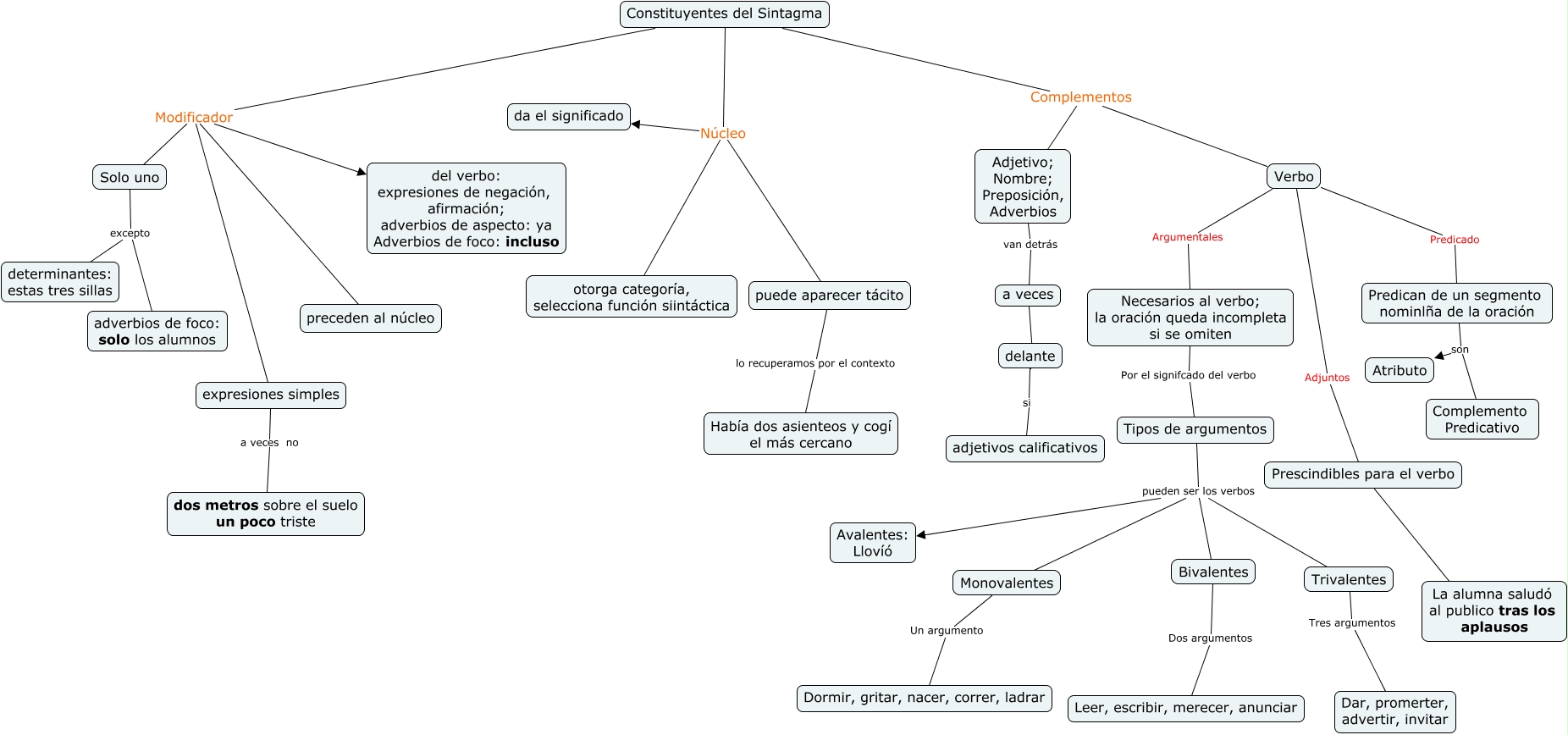 Este Cmap, tiene información relacionada con: Constituyenes del Sintagma, Predican de un segmento nominlña de la oración son Atributo, Tipos de argumentos pueden ser los verbos Monovalentes, Constituyentes del Sintagma Modificador preceden al núcleo, Constituyentes del Sintagma Complementos Verbo, Constituyentes del Sintagma Núcleo otorga categoría, selecciona función siintáctica, Predican de un segmento nominlña de la oración son Complemento Predicativo, expresiones simples a veces no dos metros sobre el suelo un poco triste, Verbo Adjuntos Prescindibles para el verbo, Adjetivo; Nombre; Preposición, Adverbios van detrás a veces, Solo uno excepto determinantes: estas tres sillas, Tipos de argumentos pueden ser los verbos Trivalentes, Trivalentes Tres argumentos Dar, promerter, advertir, invitar, Constituyentes del Sintagma Complementos Adjetivo; Nombre; Preposición, Adverbios, a veces ???? delante, Tipos de argumentos pueden ser los verbos Avalentes: Llovíó, puede aparecer tácito lo recuperamos por el contexto Había dos asienteos y cogí el más cercano, Constituyentes del Sintagma Núcleo da el significado, Solo uno excepto adverbios de foco: solo los alumnos, Constituyentes del Sintagma Modificador expresiones simples, Verbo Predicado Predican de un segmento nominlña de la oración