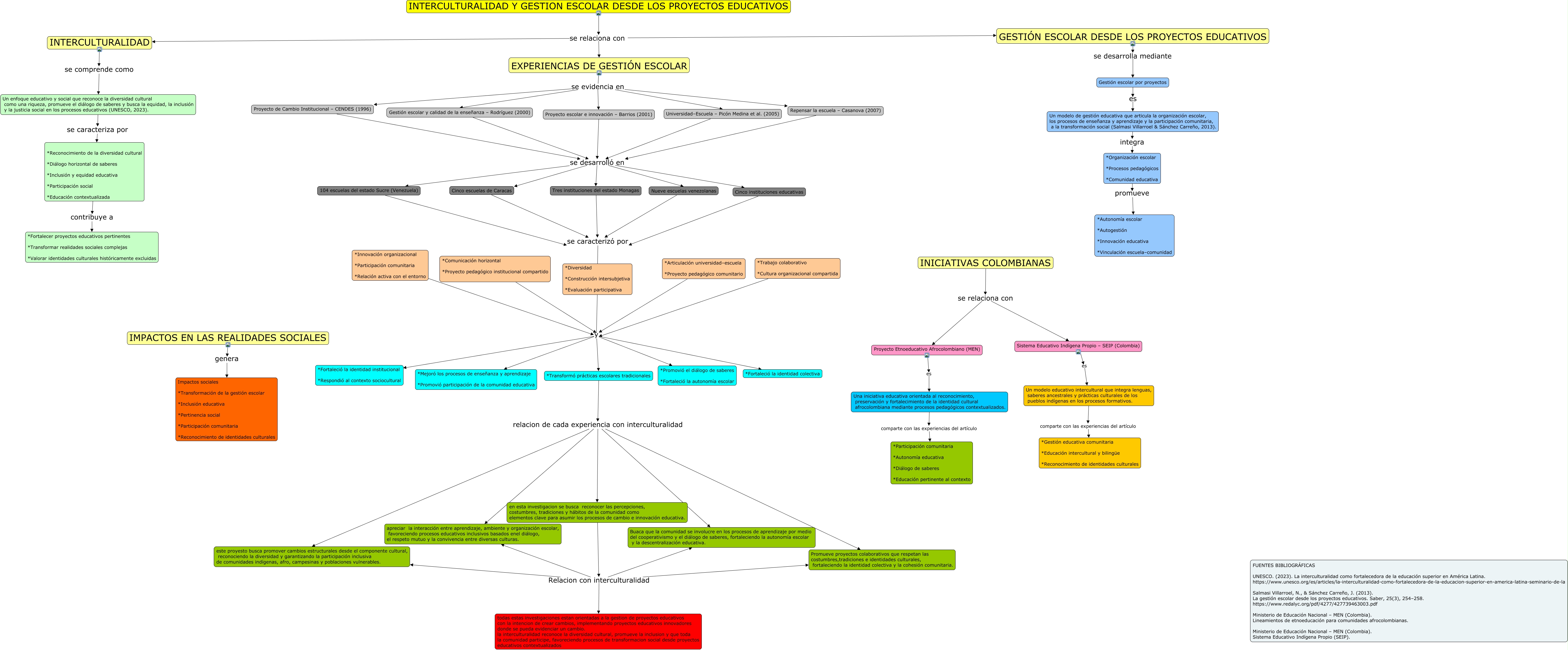 Este Cmap, tiene información relacionada con: Incorporación de características específicas de un proyecto educativo, Proyecto escolar e innovación – Barrios (2001) se desarrolló en 104 escuelas del estado Sucre (Venezuela), Un modelo de gestión educativa que articula la organización escolar, los procesos de enseñanza y aprendizaje y la participación comunitaria, a la transformación social (Salmasi Villarroel & Sánchez Carreño, 2013). integra *Organización escolar *Procesos pedagógicos *Comunidad educativa, Cinco instituciones educativas se caracterizó por *Diversidad *Construcción intersubjetiva *Evaluación participativa, Proyecto escolar e innovación – Barrios (2001) se desarrolló en Cinco escuelas de Caracas, *Comunicación horizontal *Proyecto pedagógico institucional compartido y *Transformó prácticas escolares tradicionales, Proyecto de Cambio Institucional – CENDES (1996) se desarrolló en Nueve escuelas venezolanas, *Articulación universidad–escuela *Proyecto pedagógico comunitario y *Promovió el diálogo de saberes *Fortaleció la autonomía escolar, *Organización escolar *Procesos pedagógicos *Comunidad educativa promueve *Autonomía escolar *Autogestión *Innovación educativa *Vinculación escuela–comunidad, Repensar la escuela – Casanova (2007) se desarrolló en Cinco escuelas de Caracas, *Articulación universidad–escuela *Proyecto pedagógico comunitario y *Fortaleció la identidad colectiva, EXPERIENCIAS DE GESTIÓN ESCOLAR se evidencia en Proyecto de Cambio Institucional – CENDES (1996), Proyecto de Cambio Institucional – CENDES (1996) se desarrolló en Cinco instituciones educativas, *Transformó prácticas escolares tradicionales relacion de cada experiencia con interculturalidad este proyesto busca promover cambios estructurales desde el componente cultural, reconociendo la diversidad y garantizando la participación inclusiva de comunidades indígenas, afro, campesinas y poblaciones vulnerables., Sistema Educativo Indígena Propio – SEIP (Colombia) es Un modelo educativo intercultural que integra lenguas, saberes ancestrales y prácticas culturales de los pueblos indígenas en los procesos formativos., GESTIÓN ESCOLAR DESDE LOS PROYECTOS EDUCATIVOS se desarrolla mediante Gestión escolar por proyectos, Universidad–Escuela – Picón Medina et al. (2005) se desarrolló en Cinco instituciones educativas, *Transformó prácticas escolares tradicionales relacion de cada experiencia con interculturalidad apreciar la interacción entre aprendizaje, ambiente y organización escolar, favoreciendo procesos educativos inclusivos basados enel diálogo, el respeto mutuo y la convivencia entre diversas culturas., Una iniciativa educativa orientada al reconocimiento, preservación y fortalecimiento de la identidad cultural afrocolombiana mediante procesos pedagógicos contextualizados. comparte con las experiencias del artículo *Participación comunitaria *Autonomía educativa *Diálogo de saberes *Educación pertinente al contexto, EXPERIENCIAS DE GESTIÓN ESCOLAR se evidencia en Universidad–Escuela – Picón Medina et al. (2005), Un enfoque educativo y social que reconoce la diversidad cultural como una riqueza, promueve el diálogo de saberes y busca la equidad, la inclusión y la justicia social en los procesos educativos (UNESCO, 2023). se caracteriza por *Reconocimiento de la diversidad cultural *Diálogo horizontal de saberes *Inclusión y equidad educativa *Participación social *Educación contextualizada