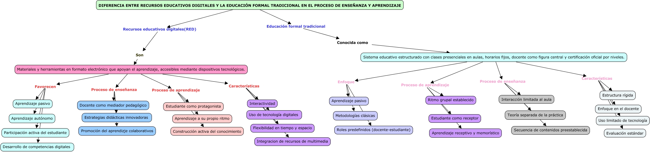 Este Cmap, tiene información relacionada con: Mapa conceptual-recursos digitales, Materiales y herramientas en formato electrónico que apoyan el aprendizaje, accesibles mediante dispositivos tecnológicos. Proceso de aprendizaje Estudiante como protagonista, Materiales y herramientas en formato electrónico que apoyan el aprendizaje, accesibles mediante dispositivos tecnológicos. Favorecen Aprendizaje autónomo, Materiales y herramientas en formato electrónico que apoyan el aprendizaje, accesibles mediante dispositivos tecnológicos. Proceso de enseñanza Estrategias didácticas innovadoras, Materiales y herramientas en formato electrónico que apoyan el aprendizaje, accesibles mediante dispositivos tecnológicos. Características Integracion de recursos de multimedia, Sistema educativo estructurado con clases presenciales en aulas, horarios fijos, docente como figura central y certificación oficial por niveles. Características Uso limitado de tecnología, Materiales y herramientas en formato electrónico que apoyan el aprendizaje, accesibles mediante dispositivos tecnológicos. Características Uso de tecnología digitales, Sistema educativo estructurado con clases presenciales en aulas, horarios fijos, docente como figura central y certificación oficial por niveles. Características Evaluación estándar, Materiales y herramientas en formato electrónico que apoyan el aprendizaje, accesibles mediante dispositivos tecnológicos. Características Flexibilidad en tiempo y espacio, Materiales y herramientas en formato electrónico que apoyan el aprendizaje, accesibles mediante dispositivos tecnológicos. Favorecen Aprendizaje pasivo, Son Materiales y herramientas en formato electrónico que apoyan el aprendizaje, accesibles mediante dispositivos tecnológicos., DIFERENCIA ENTRE RECURSOS EDUCATIVOS DIGITALES Y LA EDUCACIÓN FORMAL TRADICIONAL EN EL PROCESO DE ENSEÑANZA Y APRENDIZAJE Recursos educativos digitales(RED) Son, Sistema educativo estructurado con clases presenciales en aulas, horarios fijos, docente como figura central y certificación oficial por niveles. Proceso de aprendizaje Estudiante como receptor, Materiales y herramientas en formato electrónico que apoyan el aprendizaje, accesibles mediante dispositivos tecnológicos. Características Interactividad, Sistema educativo estructurado con clases presenciales en aulas, horarios fijos, docente como figura central y certificación oficial por niveles. Características Estructura rígida, Materiales y herramientas en formato electrónico que apoyan el aprendizaje, accesibles mediante dispositivos tecnológicos. Proceso de enseñanza Docente como mediador pedagógico, Sistema educativo estructurado con clases presenciales en aulas, horarios fijos, docente como figura central y certificación oficial por niveles. Enfoque Aprendizaje pasivo, Materiales y herramientas en formato electrónico que apoyan el aprendizaje, accesibles mediante dispositivos tecnológicos. Favorecen Participación activa del estudiante, Materiales y herramientas en formato electrónico que apoyan el aprendizaje, accesibles mediante dispositivos tecnológicos. Proceso de aprendizaje Aprendizaje a su propio ritmo, Sistema educativo estructurado con clases presenciales en aulas, horarios fijos, docente como figura central y certificación oficial por niveles. Enfoque Roles predefinidos (docente-estudiante), Sistema educativo estructurado con clases presenciales en aulas, horarios fijos, docente como figura central y certificación oficial por niveles. Proceso de enseñanza Secuencia de contenidos preestablecida