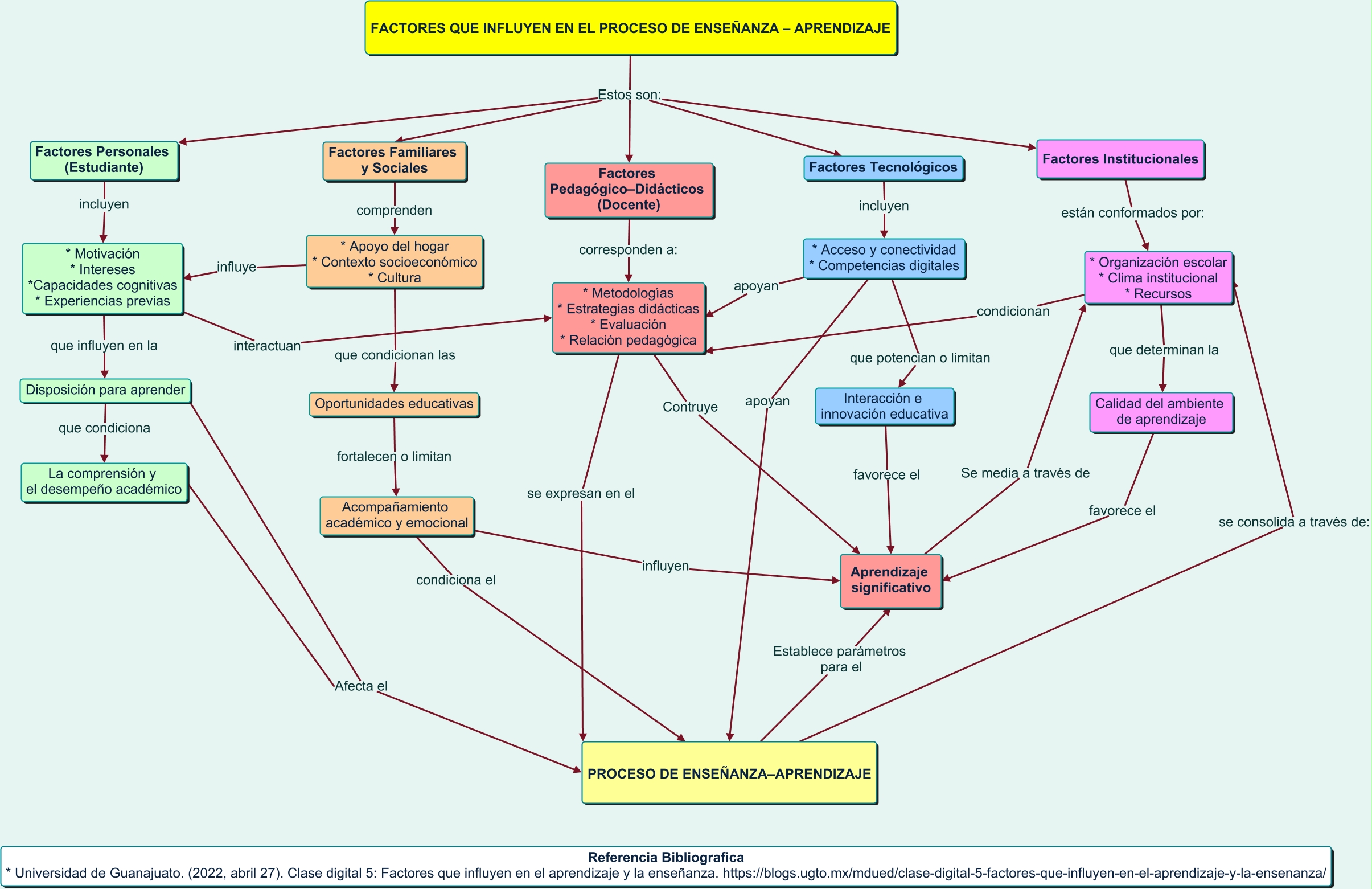 Este Cmap, tiene información relacionada con: Factores que influyen en el proceso de enseñanza–aprendizaje, * Acceso y conectividad * Competencias digitales apoyan PROCESO DE ENSEÑANZA–APRENDIZAJE, Disposición para aprender Afecta el PROCESO DE ENSEÑANZA–APRENDIZAJE, Factores Personales (Estudiante) incluyen * Motivación * Intereses *Capacidades cognitivas * Experiencias previas, * Organización escolar * Clima institucional * Recursos que determinan la Calidad del ambiente de aprendizaje, PROCESO DE ENSEÑANZA–APRENDIZAJE se consolida a través de: * Organización escolar * Clima institucional * Recursos, * Organización escolar * Clima institucional * Recursos condicionan * Metodologías * Estrategias didácticas * Evaluación * Relación pedagógica, Calidad del ambiente de aprendizaje favorece el Aprendizaje significativo, FACTORES QUE INFLUYEN EN EL PROCESO DE ENSEÑANZA – APRENDIZAJE Estos son: Factores Personales (Estudiante), FACTORES QUE INFLUYEN EN EL PROCESO DE ENSEÑANZA – APRENDIZAJE Estos son: Factores Familiares y Sociales, PROCESO DE ENSEÑANZA–APRENDIZAJE Establece parámetros para el Aprendizaje significativo, Interacción e innovación educativa favorece el Aprendizaje significativo, Oportunidades educativas fortalecen o limitan Acompañamiento académico y emocional, FACTORES QUE INFLUYEN EN EL PROCESO DE ENSEÑANZA – APRENDIZAJE Estos son: Factores Tecnológicos, * Metodologías * Estrategias didácticas * Evaluación * Relación pedagógica Contruye Aprendizaje significativo, Factores Tecnológicos incluyen * Acceso y conectividad * Competencias digitales, Aprendizaje significativo Se media a través de * Organización escolar * Clima institucional * Recursos, FACTORES QUE INFLUYEN EN EL PROCESO DE ENSEÑANZA – APRENDIZAJE Estos son: Factores Institucionales, Factores Pedagógico–Didácticos (Docente) corresponden a: * Metodologías * Estrategias didácticas * Evaluación * Relación pedagógica, FACTORES QUE INFLUYEN EN EL PROCESO DE ENSEÑANZA – APRENDIZAJE Estos son: Factores Pedagógico–Didácticos (Docente), * Apoyo del hogar * Contexto socioeconómico * Cultura influye * Motivación * Intereses *Capacidades cognitivas * Experiencias previas