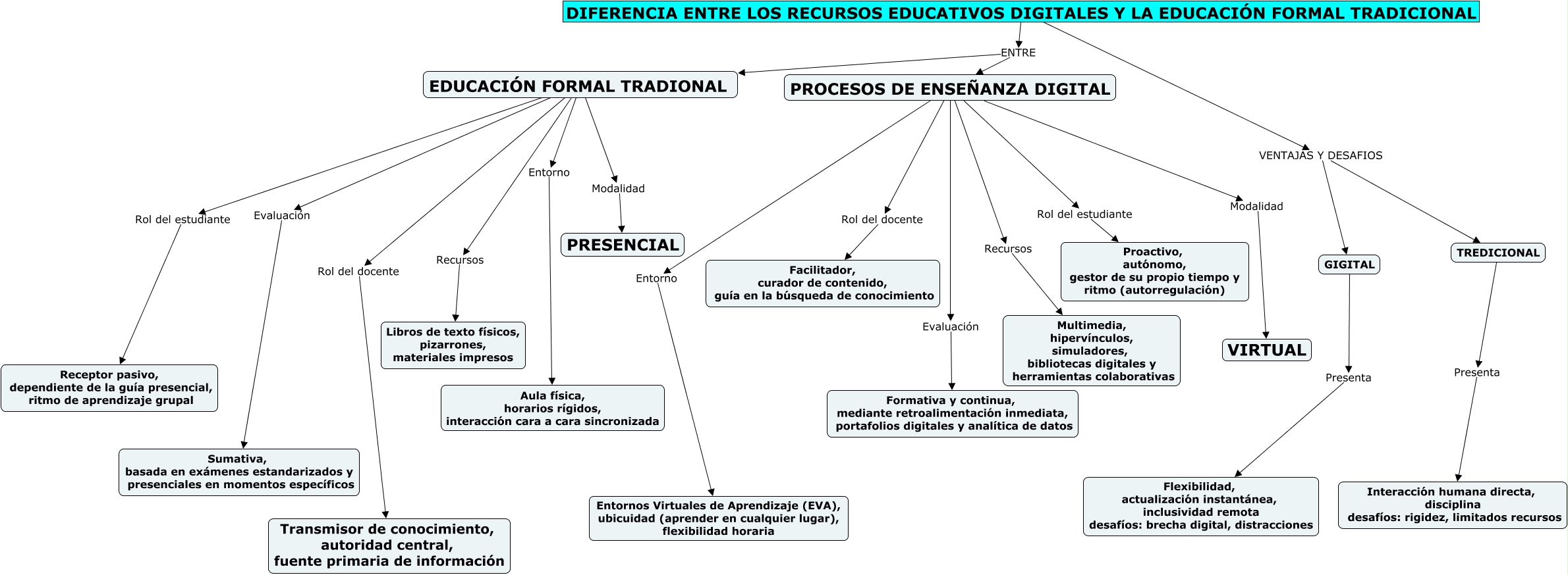 Este Cmap, tiene información relacionada con: diferencia entre RED y educacìón tradicional.1, PROCESOS DE ENSEÑANZA DIGITAL Entorno Entornos Virtuales de Aprendizaje (EVA), ubicuidad (aprender en cualquier lugar), flexibilidad horaria, EDUCACIÓN FORMAL TRADIONAL Rol del docente Transmisor de conocimiento, autoridad central, fuente primaria de información, PROCESOS DE ENSEÑANZA DIGITAL Evaluación Formativa y continua, mediante retroalimentación inmediata, portafolios digitales y analítica de datos, DIFERENCIA ENTRE LOS RECURSOS EDUCATIVOS DIGITALES Y LA EDUCACIÓN FORMAL TRADICIONAL VENTAJAS Y DESAFIOS GIGITAL, PROCESOS DE ENSEÑANZA DIGITAL Recursos Multimedia, hipervínculos, simuladores, bibliotecas digitales y herramientas colaborativas, DIFERENCIA ENTRE LOS RECURSOS EDUCATIVOS DIGITALES Y LA EDUCACIÓN FORMAL TRADICIONAL ENTRE PROCESOS DE ENSEÑANZA DIGITAL, PROCESOS DE ENSEÑANZA DIGITAL Rol del docente Facilitador, curador de contenido, guía en la búsqueda de conocimiento, PROCESOS DE ENSEÑANZA DIGITAL Rol del estudiante Proactivo, autónomo, gestor de su propio tiempo y ritmo (autorregulación), EDUCACIÓN FORMAL TRADIONAL Modalidad PRESENCIAL, EDUCACIÓN FORMAL TRADIONAL Rol del estudiante Receptor pasivo, dependiente de la guía presencial, ritmo de aprendizaje grupal, GIGITAL Presenta Flexibilidad, actualización instantánea, inclusividad remota desafíos: brecha digital, distracciones, EDUCACIÓN FORMAL TRADIONAL Entorno Aula física, horarios rígidos, interacción cara a cara sincronizada, DIFERENCIA ENTRE LOS RECURSOS EDUCATIVOS DIGITALES Y LA EDUCACIÓN FORMAL TRADICIONAL ENTRE EDUCACIÓN FORMAL TRADIONAL, EDUCACIÓN FORMAL TRADIONAL Evaluación Sumativa, basada en exámenes estandarizados y presenciales en momentos específicos, DIFERENCIA ENTRE LOS RECURSOS EDUCATIVOS DIGITALES Y LA EDUCACIÓN FORMAL TRADICIONAL VENTAJAS Y DESAFIOS TREDICIONAL, PROCESOS DE ENSEÑANZA DIGITAL Modalidad VIRTUAL, TREDICIONAL Presenta Interacción humana directa, disciplina desafíos: rigidez, limitados recursos, EDUCACIÓN FORMAL TRADIONAL Recursos Libros de texto físicos, pizarrones, materiales impresos
