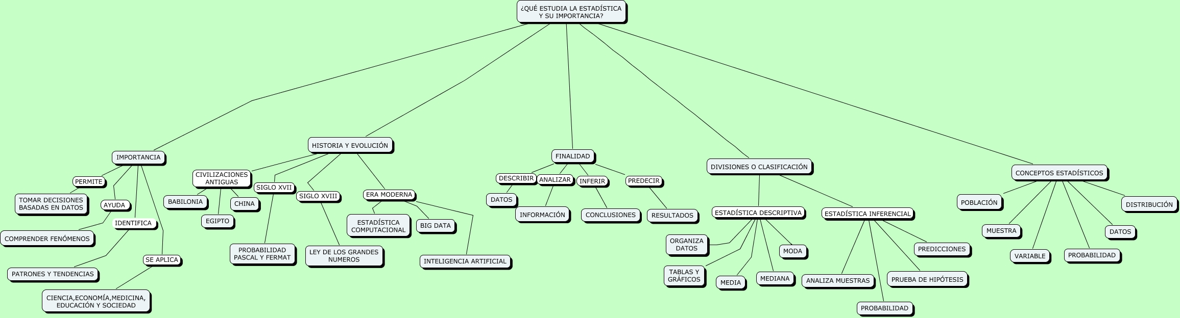 This Concept Map, created with IHMC CmapTools, has information related to: MAPA CONCEPTUAL TAREA, ¿QUÉ ESTUDIA LA ESTADÍSTICA Y SU IMPORTANCIA? ???? CONCEPTOS ESTADÍSTICOS, DIVISIONES O CLASIFICACIÓN ESTADÍSTICA DESCRIPTIVA TABLAS Y GRÁFICOS, ¿QUÉ ESTUDIA LA ESTADÍSTICA Y SU IMPORTANCIA? ???? DIVISIONES O CLASIFICACIÓN, HISTORIA Y EVOLUCIÓN SIGLO XVII PROBABILIDAD PASCAL Y FERMAT, IMPORTANCIA PERMITE TOMAR DECISIONES BASADAS EN DATOS, DIVISIONES O CLASIFICACIÓN ESTADÍSTICA INFERENCIAL PREDICCIONES, DIVISIONES O CLASIFICACIÓN ESTADÍSTICA DESCRIPTIVA MEDIA, DIVISIONES O CLASIFICACIÓN ESTADÍSTICA INFERENCIAL ANALIZA MUESTRAS, IMPORTANCIA SE APLICA CIENCIA,ECONOMÍA,MEDICINA, EDUCACIÓN Y SOCIEDAD, HISTORIA Y EVOLUCIÓN CIVILIZACIONES ANTIGUAS BABILONIA, FINALIDAD PREDECIR RESULTADOS, CONCEPTOS ESTADÍSTICOS ???? DISTRIBUCIÓN, ¿QUÉ ESTUDIA LA ESTADÍSTICA Y SU IMPORTANCIA? ???? FINALIDAD, DIVISIONES O CLASIFICACIÓN ESTADÍSTICA DESCRIPTIVA ORGANIZA DATOS, HISTORIA Y EVOLUCIÓN CIVILIZACIONES ANTIGUAS CHINA, DIVISIONES O CLASIFICACIÓN ESTADÍSTICA INFERENCIAL PRUEBA DE HIPÓTESIS, HISTORIA Y EVOLUCIÓN ERA MODERNA ESTADÍSTICA COMPUTACIONAL, CONCEPTOS ESTADÍSTICOS ???? VARIABLE, CONCEPTOS ESTADÍSTICOS ???? PROBABILIDAD, DIVISIONES O CLASIFICACIÓN ESTADÍSTICA DESCRIPTIVA MEDIANA