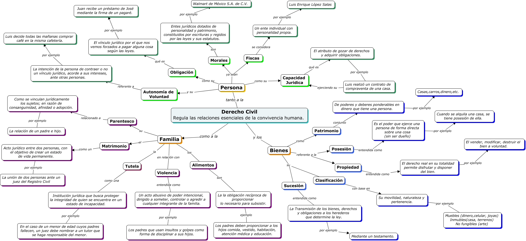 Este Cmap, tiene información relacionada con: Derecho Civil, Un ente individual con personalidad propia. por ejemplo Luis Enrique López Salas, Persona y su Autonomía de Voluntad, Entes jurídicos dotados de personalidad y patrimonio, constituidos por escrituras y regidos por las leyes y sus estatutos. por ejemplo Walmart de México S.A. de C.V., Bienes su Clasificación, Como se vinculan jurídicamente los sujetos; en razón de consanguinidad, afinidad o adopción. por ejemplo La relación de un padre e hijo., La la obligación recíproca de proporcionar lo necesario para subsistir. ejemplo Los padres deben proporcionar a los hijos comida, vestido, habitación, atención médica y educación., Familia los Alimentos, Familia en relación con Violencia, Persona como su Capacidad Juridica, Propiedad entendida como El derecho real en su totalidad permite disfrutar y disponer del bien., Patrimonio conjunto De poderes y deberes ponderables en dinero que tiene una persona., El atributo de gozar de derechos y adquirir obligaciones. por ejemplo Luis realizó un contrato de compraventa de una casa., Bienes su Sucesión, Persona tanto a la Derecho Civil Regula las relaciones esenciales de la convivencia humana., El vínculo jurídico por el que nos vemos forzados a pagar alguna cosa según las leyes. por ejemplo Juan recibe un préstamo de José mediante la firma de un pagaré., Obligación qué es El vínculo jurídico por el que nos vemos forzados a pagar alguna cosa según las leyes., Bienes referente a la Posesión, Acto jurídico entre dos personas, con el objetivo de crear un estado de vida permanente. por ejemplo La unión de dos personas ante un juez del Registro Civil, La intención de la persona de contraer o no un vínculo jurídico, acorde a sus intereses, ante otras personas. por ejemplo Luis decide todas las mañanas comprar café en la misma cafetería., Clasificación con base en Su movilidad, naturaleza y pertenencia.