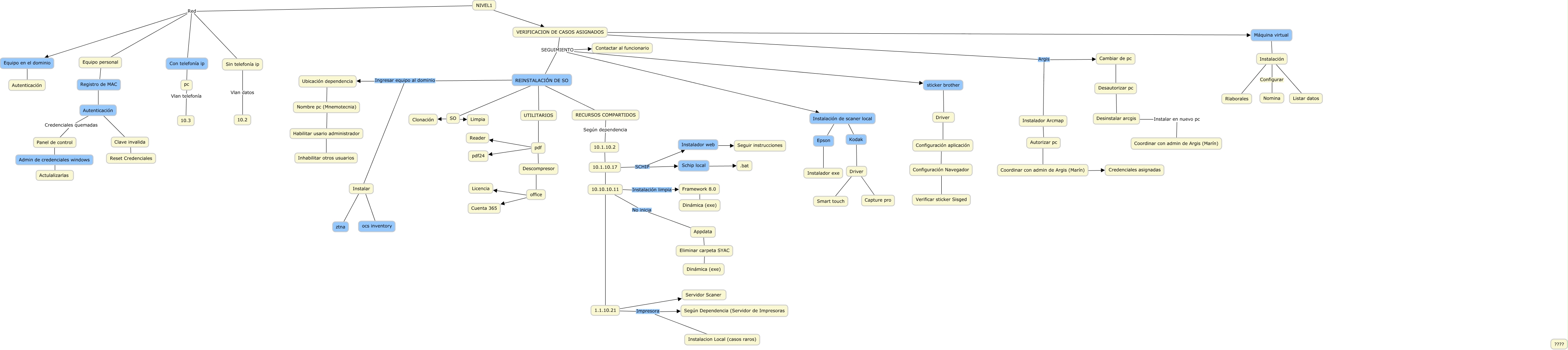 Este Cmap, tiene información relacionada con: process, REINSTALACIÓN DE SO ???? RECURSOS COMPARTIDOS, office ???? Cuenta 365, 1.1.10.21 ???? Servidor Scaner, NIVEL1 Red Equipo personal, office ???? Licencia, Configuración Navegador ???? Verificar sticker Sisged, VERIFICACION DE CASOS ASIGNADOS SEGUIMIENTO Contactar al funcionario, Instalación de scaner local ???? Epson, Coordinar con admin de Argis (Marín) ???? Credenciales asignadas, REINSTALACIÓN DE SO Ingresar equipo al dominio Instalar, Nombre pc (Mnemotecnia) ???? Habilitar usario administrador, Desautorizar pc ???? Desinstalar arcgis, Sin telefonía ip Vlan datos 10.2, Instalar ???? ocs inventory, Panel de control ???? Admin de credenciales windows, Descompresor ???? office, Con telefonía ip ???? pc, REINSTALACIÓN DE SO ???? UTILITARIOS, REINSTALACIÓN DE SO ???? SO, NIVEL1 ???? VERIFICACION DE CASOS ASIGNADOS