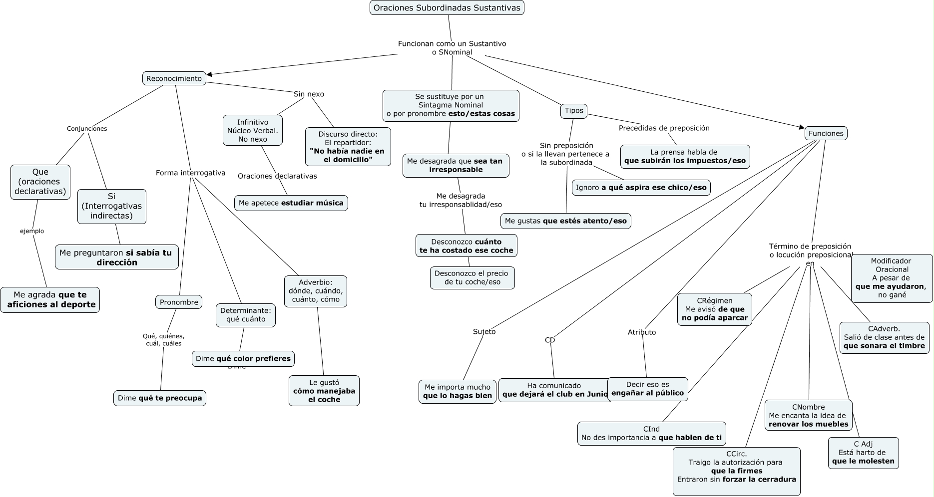 Este Cmap, tiene información relacionada con: Subordinadas Sustantivas, Funciones Atributo Decir eso es engañar al público, Funciones Término de preposición o locución preposicional en CInd No des importancia a que hablen de ti, Reconocimiento Conjunciones Si (Interrogativas indirectas), Infinitivo Núcleo Verbal. No nexo Oraciones declarativas Me apetece estudiar música, Funciones Término de preposición o locución preposicional en Modificador Oracional A pesar de que me ayudaron, no gané, Oraciones Subordinadas Sustantivas Funcionan como un Sustantivo o SNominal Tipos, Adverbio: dónde, cuándo, cuánto, cómo ???? Le gustó cómo manejaba el coche, Que (oraciones declarativas) ejemplo Me agrada que te aficiones al deporte, Funciones Término de preposición o locución preposicional en CNombre Me encanta la idea de renovar los muebles, Funciones Término de preposición o locución preposicional en CRégimen Me avisó de que no podía aparcar, Reconocimiento Conjunciones Que (oraciones declarativas), Tipos Sin preposición o si la llevan pertenece a la subordinada Ignoro a qué aspira ese chico/eso, Reconocimiento Sin nexo Discurso directo: El repartidor: "No había nadie en el domicilio", Funciones Sujeto Me importa mucho que lo hagas bien, Reconocimiento Forma interrogativa Determinante: qué cuánto, Funciones CD Ha comunicado que dejará el club en Junio, Funciones Término de preposición o locución preposicional en C Adj Está harto de que le molesten, Si (Interrogativas indirectas) M Me preguntaron si sabía tu dirección, Tipos Sin preposición o si la llevan pertenece a la subordinada Me gustas que estés atento/eso, Reconocimiento Forma interrogativa Pronombre