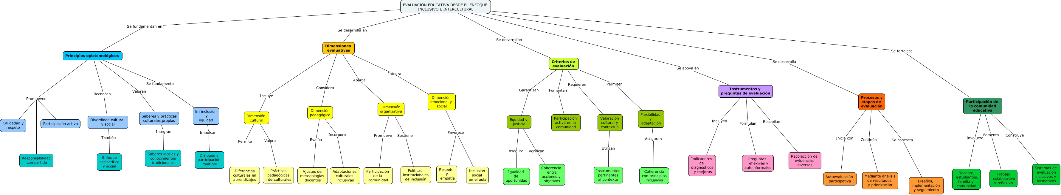 Este Cmap, tiene información relacionada con: EvaluacEvaluación educativa desde el enfoque inclusivo e interculturalión educativa desde el enfoque inclusivo e intercultural, Instrumentos y preguntas de evaluación Recopilan Recolección de evidencias diversas, Criterios de evaluación Requieren Valoración cultural y contextual, Flexibilidad y adaptación Aseguran Coherencia con principios inclusivos, Instrumentos y preguntas de evaluación Incluyen Indicadores de diagnósticos y mejoras, Participación de la comunidad educativa Construye Sistemas de evaluación inclusivos y formativos, Diverdidad cultural y social Tambén Enfoque sociocrítico y social, Participación de la comunidad educativa Fomenta Trabajo colaborativo y reflexivo, Dimensiones evaluativas Integra Dimensión emocional y social, EVALUACIÓN EDUCATIVA DESDE EL ENFOQUE INCLUSIVO E INTERCULTURAL Se desarrolla en Dimensiones evaluativas, Dimensión cultural Valora Prácticas pedagógicas interculturales, Procesos y etapas de evaluación Inicia con Autoevaluación participativa, Criterios de evaluación Permiten Flexibilidad y adaptación, Dimensión organizativa Sostiene Políticas institucionales de inclusión, Procesos y etapas de evaluación Se concreta Diseños, implementación y seguimiento, Criterios de evaluación Garantizan Equidad y justicia, Principios epistemológicos Valoran Saberes y prácticas culturales propias, EVALUACIÓN EDUCATIVA DESDE EL ENFOQUE INCLUSIVO E INTERCULTURAL Se fortalece Participación de la comunidad educativa, Dimensión emocional y social Favorece Inclusión social en el aula, Procesos y etapas de evaluación Continúa Mediante análisis de resultados y priorización, Saberes y prácticas culturales propias Integran Saberes locales y conocimientos tradicionales