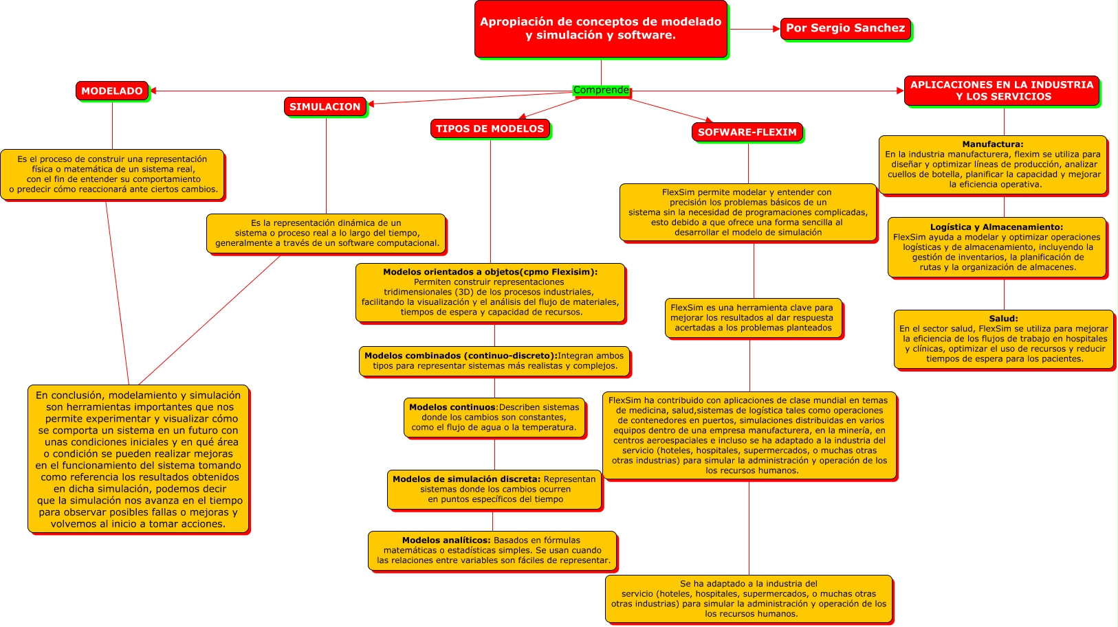 Este Cmap, tiene información relacionada con: APROPIACION DE CONCEPTOS DE MODELADO, APLICACIONES EN LA INDUSTRIA Y LOS SERVICIOS ???? Salud: En el sector salud, FlexSim se utiliza para mejorar la eficiencia de los flujos de trabajo en hospitales y clínicas, optimizar el uso de recursos y reducir tiempos de espera para los pacientes., FlexSim ha contribuido con aplicaciones de clase mundial en temas de medicina, salud,sistemas de logística tales como operaciones de contenedores en puertos, simulaciones distribuidas en varios equipos dentro de una empresa manufacturera, en la minería, en centros aeroespaciales e incluso se ha adaptado a la industria del servicio (hoteles, hospitales, supermercados, o muchas otras otras industrias) para simular la administración y operación de los los recursos humanos. ???? Se ha adaptado a la industria del servicio (hoteles, hospitales, supermercados, o muchas otras otras industrias) para simular la administración y operación de los los recursos humanos., SOFWARE-FLEXIM ???? FlexSim permite modelar y entender con precisión los problemas básicos de un sistema sin la necesidad de programaciones complicadas, esto debido a que ofrece una forma sencilla al desarrollar el modelo de simulación, Apropiación de conceptos de modelado y simulación y software. Comprende TIPOS DE MODELOS, SIMULACION ???? Es la representación dinámica de un sistema o proceso real a lo largo del tiempo, generalmente a través de un software computacional., Apropiación de conceptos de modelado y simulación y software. Comprende APLICACIONES EN LA INDUSTRIA Y LOS SERVICIOS, MODELADO ???? Es el proceso de construir una representación física o matemática de un sistema real, con el fin de entender su comportamiento o predecir cómo reaccionará ante ciertos cambios., Apropiación de conceptos de modelado y simulación y software. Comprende MODELADO, Modelos continuos:Describen sistemas donde los cambios son constantes, como el flujo de agua o la temperatura. ???? Modelos de simulación discreta: Representan sistemas donde los cambios ocurren en puntos específicos del tiempo, Modelos de simulación discreta: Representan sistemas donde los cambios ocurren en puntos específicos del tiempo ???? Modelos analíticos: Basados en fórmulas matemáticas o estadísticas simples. Se usan cuando las relaciones entre variables son fáciles de representar., Es la representación dinámica de un sistema o proceso real a lo largo del tiempo, generalmente a través de un software computacional. ???? En conclusión, modelamiento y simulación son herramientas importantes que nos permite experimentar y visualizar cómo se comporta un sistema en un futuro con unas condiciones iniciales y en qué área o condición se pueden realizar mejoras en el funcionamiento del sistema tomando como referencia los resultados obtenidos en dicha simulación, podemos decir que la simulación nos avanza en el tiempo para observar posibles fallas o mejoras y volvemos al inicio a tomar acciones., Apropiación de conceptos de modelado y simulación y software. Comprende SOFWARE-FLEXIM, Apropiación de conceptos de modelado y simulación y software. ???? Por Sergio Sanchez, FlexSim es una herramienta clave para mejorar los resultados al dar respuesta acertadas a los problemas planteados ???? FlexSim ha contribuido con aplicaciones de clase mundial en temas de medicina, salud,sistemas de logística tales como operaciones de contenedores en puertos, simulaciones distribuidas en varios equipos dentro de una empresa manufacturera, en la minería, en centros aeroespaciales e incluso se ha adaptado a la industria del servicio (hoteles, hospitales, supermercados, o muchas otras otras industrias) para simular la administración y operación de los los recursos humanos., Modelos orientados a objetos(cpmo Flexisim): Permiten construir representaciones tridimensionales (3D) de los procesos industriales, facilitando la visualización y el análisis del flujo de materiales, tiempos de espera y capacidad de recursos. ???? Modelos combinados (continuo-discreto):Integran ambos tipos para representar sistemas más realistas y complejos., FlexSim permite modelar y entender con precisión los problemas básicos de un sistema sin la necesidad de programaciones complicadas, esto debido a que ofrece una forma sencilla al desarrollar el modelo de simulación ???? FlexSim es una herramienta clave para mejorar los resultados al dar respuesta acertadas a los problemas planteados, TIPOS DE MODELOS ???? Modelos orientados a objetos(cpmo Flexisim): Permiten construir representaciones tridimensionales (3D) de los procesos industriales, facilitando la visualización y el análisis del flujo de materiales, tiempos de espera y capacidad de recursos., Es el proceso de construir una representación física o matemática de un sistema real, con el fin de entender su comportamiento o predecir cómo reaccionará ante ciertos cambios. ???? En conclusión, modelamiento y simulación son herramientas importantes que nos permite experimentar y visualizar cómo se comporta un sistema en un futuro con unas condiciones iniciales y en qué área o condición se pueden realizar mejoras en el funcionamiento del sistema tomando como referencia los resultados obtenidos en dicha simulación, podemos decir que la simulación nos avanza en el tiempo para observar posibles fallas o mejoras y volvemos al inicio a tomar acciones., Apropiación de conceptos de modelado y simulación y software. Comprende SIMULACION, Modelos combinados (continuo-discreto):Integran ambos tipos para representar sistemas más realistas y complejos. ???? Modelos continuos:Describen sistemas donde los cambios son constantes, como el flujo de agua o la temperatura.