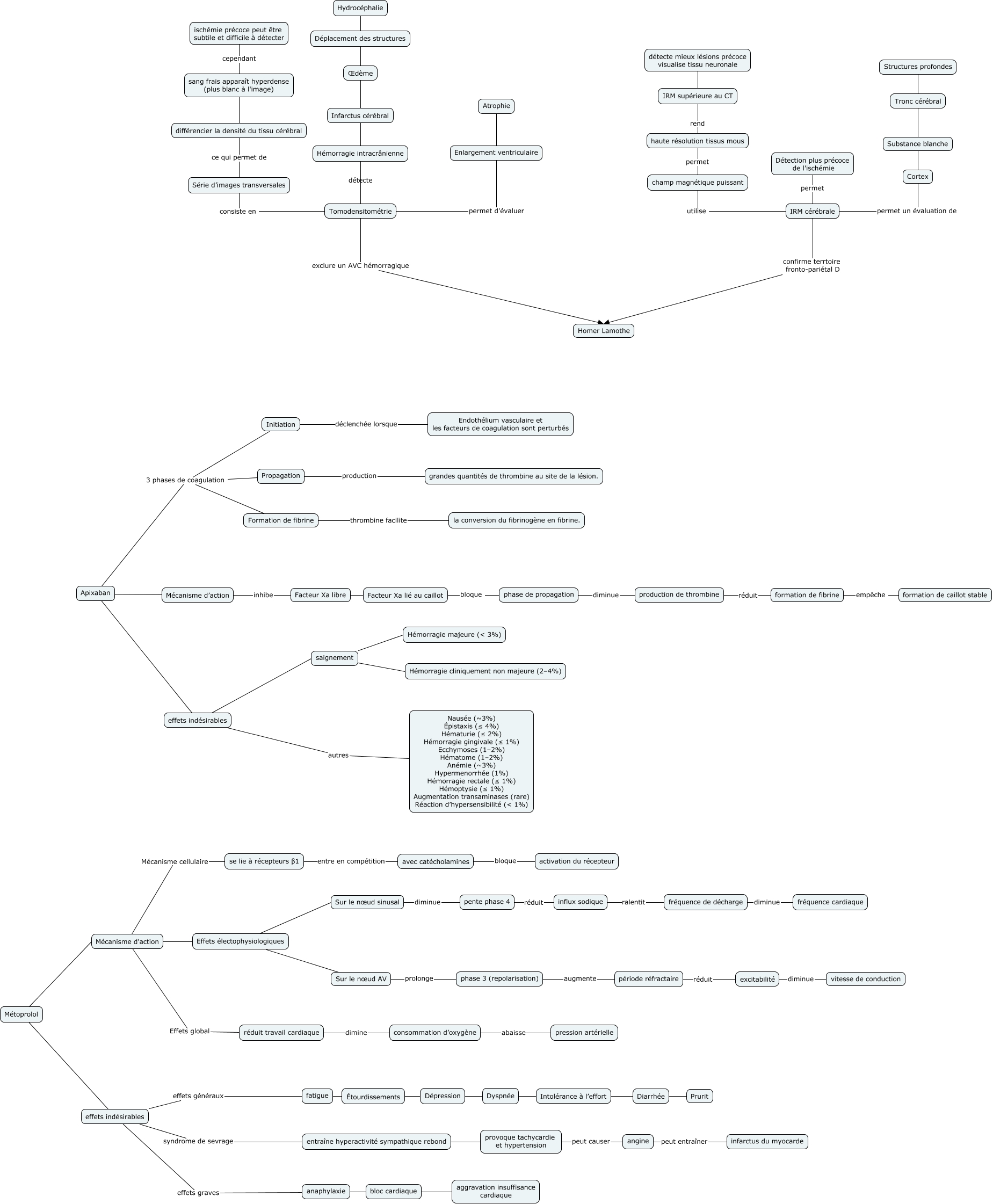 This Concept Map, created with IHMC CmapTools, has information related to: Cas 5, effets indésirables saignement, se lie à récepteurs β1 entre en compétition avec catécholamines, Formation de fibrine thrombine facilite la conversion du fibrinogène en fibrine., Apixaban 3 phases de coagulation Propagation, excitabilité diminue vitesse de conduction, différencier la densité du tissu cérébral sang frais apparaît hyperdense (plus blanc à l'image), phase de propagation diminue production de thrombine, IRM supérieure au CT détecte mieux lésions précoce visualise tissu neuronale, angine peut entraîner infarctus du myocarde, pente phase 4 réduit influx sodique, fatigue Étourdissements, Initiation déclenchée lorsque Endothélium vasculaire et les facteurs de coagulation sont perturbés, Série d’images transversales ce qui permet de différencier la densité du tissu cérébral, saignement Hémorragie majeure (< 3%), Métoprolol effets indésirables, provoque tachycardie et hypertension peut causer angine, Sur le nœud AV prolonge phase 3 (repolarisation), Mécanisme d’action inhibe Facteur Xa lié au caillot, avec catécholamines bloque activation du récepteur, haute résolution tissus mous rend IRM supérieure au CT