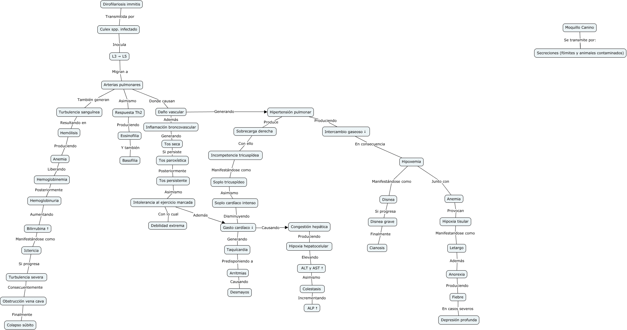 Este Cmap, tiene información relacionada con: ABP MED Y TERAP 2026 (1).cmap, Intercambio gaseoso ↓ En consecuencia Hipoxemia, Bilirrubina ↑ Manifestándose como Ictericia, Colestasis Incrementando ALP ↑, Hipertensión pulmonar Produciendo Intercambio gaseoso ↓, Sobrecarga derecha Con ello Incompetencia tricuspídea, Hipoxemia Junto con Anemia, Letargo Además Anorexia, Anemia Liberando Hemoglobinemia, Arritmias Causando Desmayos, Disnea Si progresa Disnea grave, Hipoxia tisular Manifestandose como Letargo, Soplo tricuspídeo Asimismo Soplo cardíaco intenso, Hipoxia hepatocelular Elevando ALT y AST ↑, Intolerancia al ejercicio marcada Con lo cual Debilidad extrema, Taquícardia Predisponiendo a Arritmias, Hemoglobinuria Aumentando Bilirrubina ↑, Culex spp. infectado Inocula L3 → L5, Obstrucción vena cava Finalmente Colapso súbito, Daño vascular Además Inflamación broncovascular, Respuesta Th2 Produciendo Eosinofilia