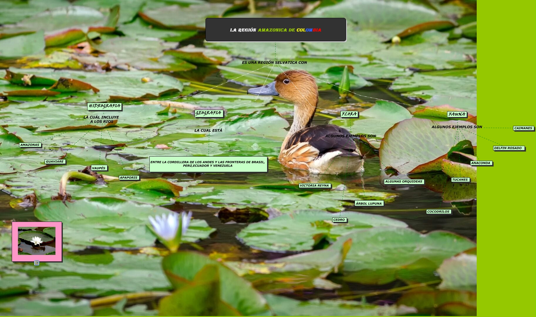 Este Cmap, tiene información relacionada con: AMAZONICA SARA YOHARY, LA REGIÓN AMAZONICA DE COLOMBIA ES UNA REGIÓN SELVATICA CON FLORA, LA REGIÓN AMAZONICA DE COLOMBIA ES UNA REGIÓN SELVATICA CON HIDROGRAFIA, FLORA ALGUNOS EJEMPLOS SON CEDRO, FAUNA ALGUNOS EJEMPLOS SON COCODRILOS, FLORA ALGUNOS EJEMPLOS SON ALGUNAS ORQUIDEAS, FAUNA ALGUNOS EJEMPLOS SON TUCANES, LA REGIÓN AMAZONICA DE COLOMBIA ES UNA REGIÓN SELVATICA CON FAUNA, GEOGRAFIA LA CUAL ESTÁ ENTRE LA CORDILLERA DE LOS ANDES Y LAS FRONTERAS DE BRASIL, PERÚ,ECUADOR Y VENEZUELA, HIDROGRAFIA LA CUÁL INCLUYE A LOS RIOS APAPORIS, FAUNA ALGUNOS EJEMPLOS SON ANACONDA, HIDROGRAFIA LA CUÁL INCLUYE A LOS RIOS VAUPÉS, FAUNA ALGUNOS EJEMPLOS SON DELFIN ROSADO, HIDROGRAFIA LA CUÁL INCLUYE A LOS RIOS AMAZONAS, FLORA ALGUNOS EJEMPLOS SON ÁRBOL LUPUNA, LA REGIÓN AMAZONICA DE COLOMBIA ES UNA REGIÓN SELVATICA CON GEOGRAFIA, FLORA ALGUNOS EJEMPLOS SON VICTORIA REYNA, FAUNA ALGUNOS EJEMPLOS SON CAIMANES, HIDROGRAFIA LA CUÁL INCLUYE A LOS RIOS GUAVIARE