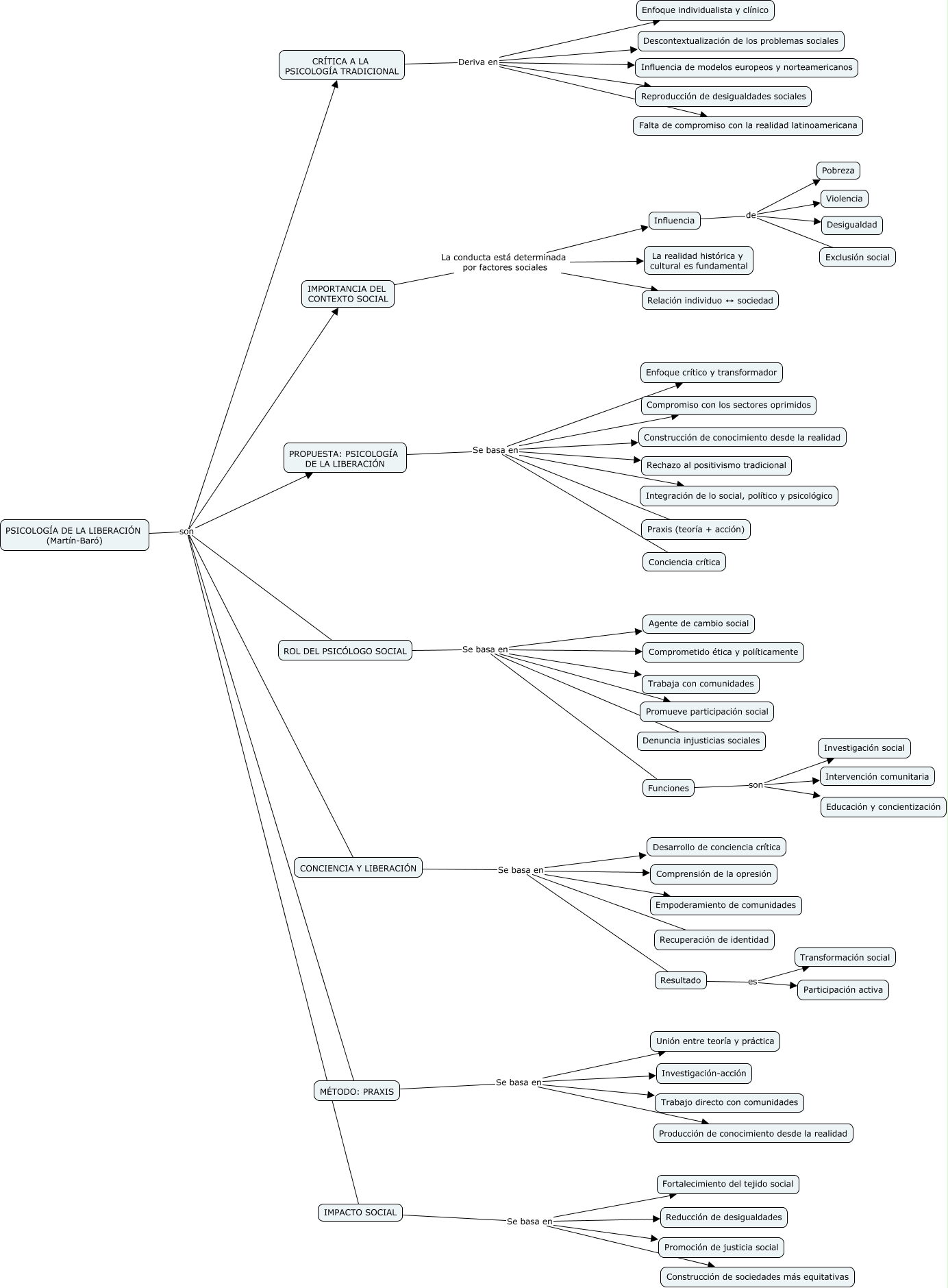 Este Cmap, tiene información relacionada con: Mapa conceptual-Yesica Alarcon, PSICOLOGÍA DE LA LIBERACIÓN (Martín-Baró) son ROL DEL PSICÓLOGO SOCIAL, ROL DEL PSICÓLOGO SOCIAL Se basa en Denuncia injusticias sociales, PROPUESTA: PSICOLOGÍA DE LA LIBERACIÓN Se basa en Praxis (teoría + acción), MÉTODO: PRAXIS Se basa en Investigación-acción, IMPACTO SOCIAL Se basa en Reducción de desigualdades, Funciones son Educación y concientización, CRÍTICA A LA PSICOLOGÍA TRADICIONAL Deriva en Enfoque individualista y clínico, CRÍTICA A LA PSICOLOGÍA TRADICIONAL Deriva en Reproducción de desigualdades sociales, IMPACTO SOCIAL Se basa en Fortalecimiento del tejido social, ROL DEL PSICÓLOGO SOCIAL Se basa en Trabaja con comunidades, IMPACTO SOCIAL Se basa en Construcción de sociedades más equitativas, Influencia de Violencia, IMPORTANCIA DEL CONTEXTO SOCIAL La conducta está determinada por factores sociales Relación individuo ↔ sociedad, IMPACTO SOCIAL Se basa en Promoción de justicia social, PSICOLOGÍA DE LA LIBERACIÓN (Martín-Baró) son MÉTODO: PRAXIS, Influencia de Exclusión social, Funciones son Intervención comunitaria, PROPUESTA: PSICOLOGÍA DE LA LIBERACIÓN Se basa en Integración de lo social, político y psicológico, CONCIENCIA Y LIBERACIÓN Se basa en Comprensión de la opresión, PROPUESTA: PSICOLOGÍA DE LA LIBERACIÓN Se basa en Construcción de conocimiento desde la realidad
