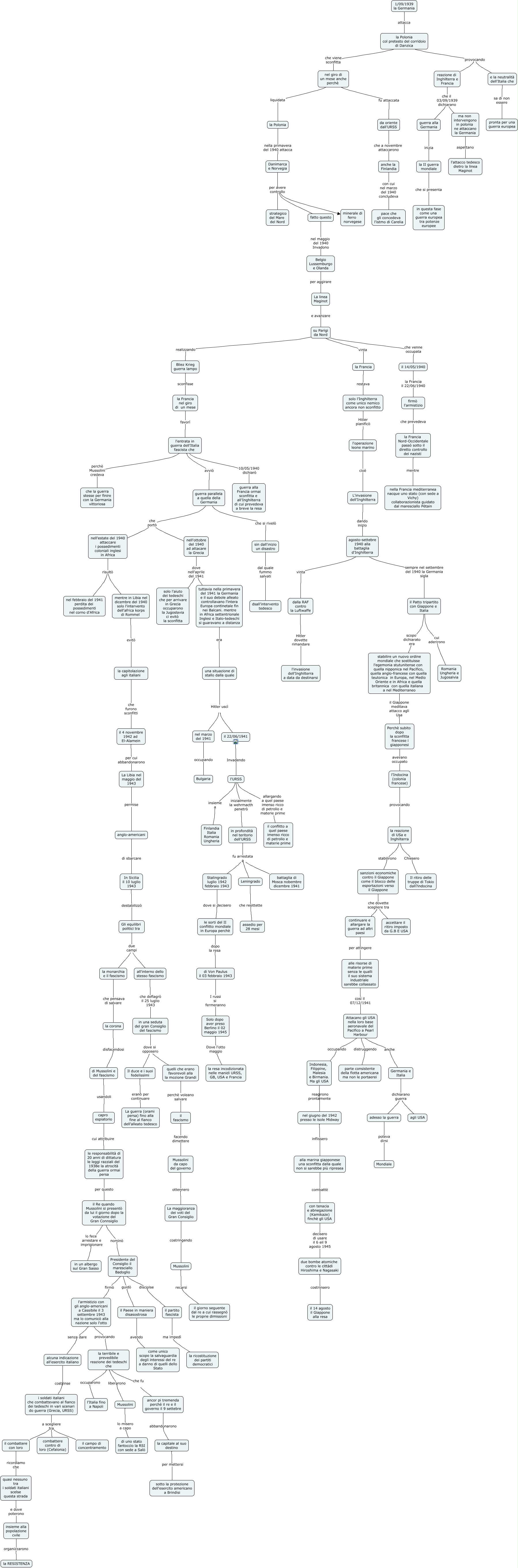 Questa Cmap, creata con IHMC CmapTools, contiene informazioni relative a: la seconda guerra mondiale parte seconda, una situazione di stallo dalla quale Hitler uscì il 22/06/1941, la Francia nel giro di un mese favorì l'entrata in guerra dell'Italia fascista che, il Paese in maniera disasostrosa avendo come unico scopo la salvaguardia degli interessi del re a danno di quelli dello Stato, all'interno dello stesso fascismo che deflagrò il 25 luglio 1943 in una seduta del gran Consiglio del fascismo, l'URSS allargando a quel paese imenso ricco di petrolio e materie prime il conflitto a quel paese imenso ricco di petrolio e materie prime, Il duce e i suoi fedelissimi erano per continuare La guerra (orami persa) fino alla fine al fianco dell'alleato tedesco, agosto-settebre 1940 alla battaglia d'Inghilterra vinta dalla RAF contro la Luftwaffe, il combattere con loro ricordiamo che quasi nessuno tra i soldati italiani scelse questa strada, l'entrata in guerra dell'Italia fascista che perchè Mussolini credeva che la guerra stesse per finire con la Germania vittoriosa, le sorti del II conflitto mondiale in Europa perchè dopo la resa di Von Paulus il 03 febbraio 1943, adesso la guerra poteva dirsi Mondiale, il 22/06/1941 Invadendo l'URSS, reazione di Inghilterra e Francia che il 03/09/1939 dichiarano ma non intervengono in polonia ne attaccano la Germania, La linea Maginot e avanzare su Parigi da Nord, nell'ottobre del 1940 ad attacare la Grecia dove nell'aprile del 1941 tuttavia nella primavera del 1941 la Germania e il suo debole alleato controllavano l'intera Europa continetale fin nei Balcani. mentre in Africa settentrionale Inglesi e Italo-tedeschi si guaravano a distanza, in una seduta del gran Consiglio del fascismo dove si opposero Il duce e i suoi fedelissimi, 1/09/1939 la Germania attacca la Polonia col pretesto del corridoio di Danzica, guerra parallela a quella della Germania che portò nell'ottobre del 1940 ad attacare la Grecia, agosto-settebre 1940 alla battaglia d'Inghilterra sempre nel settembre del 1940 la Germania sigla il Patto tripartito con Giappone e Italia, in profondità nel teritorio dell'URSS fu arrestata a Stalingrado luglio 1942 febbraio 1943