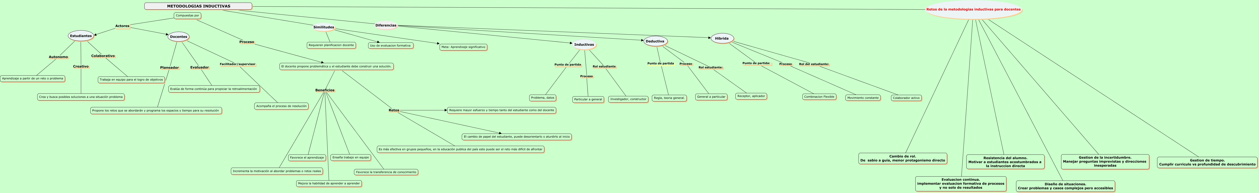 Este Cmap, tiene información relacionada con: Metodologias inductivas, METODOLOGIAS INDUCTIVAS Retos de la metodologias inductivas para docentes Gestion de la incertidumbre. Manejar preguntas imprevistas y direcciones inesperadas, Docentes Evaluador Evalúa de forma continúa para propiciar la retroalimentación, METODOLOGIAS INDUCTIVAS Similitudes Uso de evaluacion formativa, Hibrida Proceso Movimiento constante, Estudiantes Autonomo Aprendizaje a partir de un reto o problema, Docentes Planeador Propone los retos que se abordarán y programa los espacios y tiempo para su resolución, Estudiantes Creativo Crea y busca posibles soluciones a una situación problema, El docente propone problemática y el estudiante debe construir una solución. Beneficios Mejora la habilidad de aprender a aprender, METODOLOGIAS INDUCTIVAS Diferencias Inductivas, Inductivas Rol estudiante Investigador, constructor, METODOLOGIAS INDUCTIVAS Diferencias Deductiva, METODOLOGIAS INDUCTIVAS Diferencias Hibrida, METODOLOGIAS INDUCTIVAS Retos de la metodologias inductivas para docentes Gestion de tiempo. Cumplir curriculo vs profundidad de descubrimiento, El docente propone problemática y el estudiante debe construir una solución. Retos Requiere mayor esfuerzo y tiempo tanto del estudiante como del docente, METODOLOGIAS INDUCTIVAS Retos de la metodologias inductivas para docentes Diseño de situaciones. Crear problemas y casos complejos pero accesibles, Compuestas por Actores Docentes, METODOLOGIAS INDUCTIVAS Retos de la metodologias inductivas para docentes Cambio de rol. De sabio a guia, menor protagonismo directo, El docente propone problemática y el estudiante debe construir una solución. Beneficios Enseña trabajo en equipo, Hibrida Rol del estudiante: Colaborador activo, El docente propone problemática y el estudiante debe construir una solución. Beneficios Incrementa la motivación al abordar problemas o retos reales