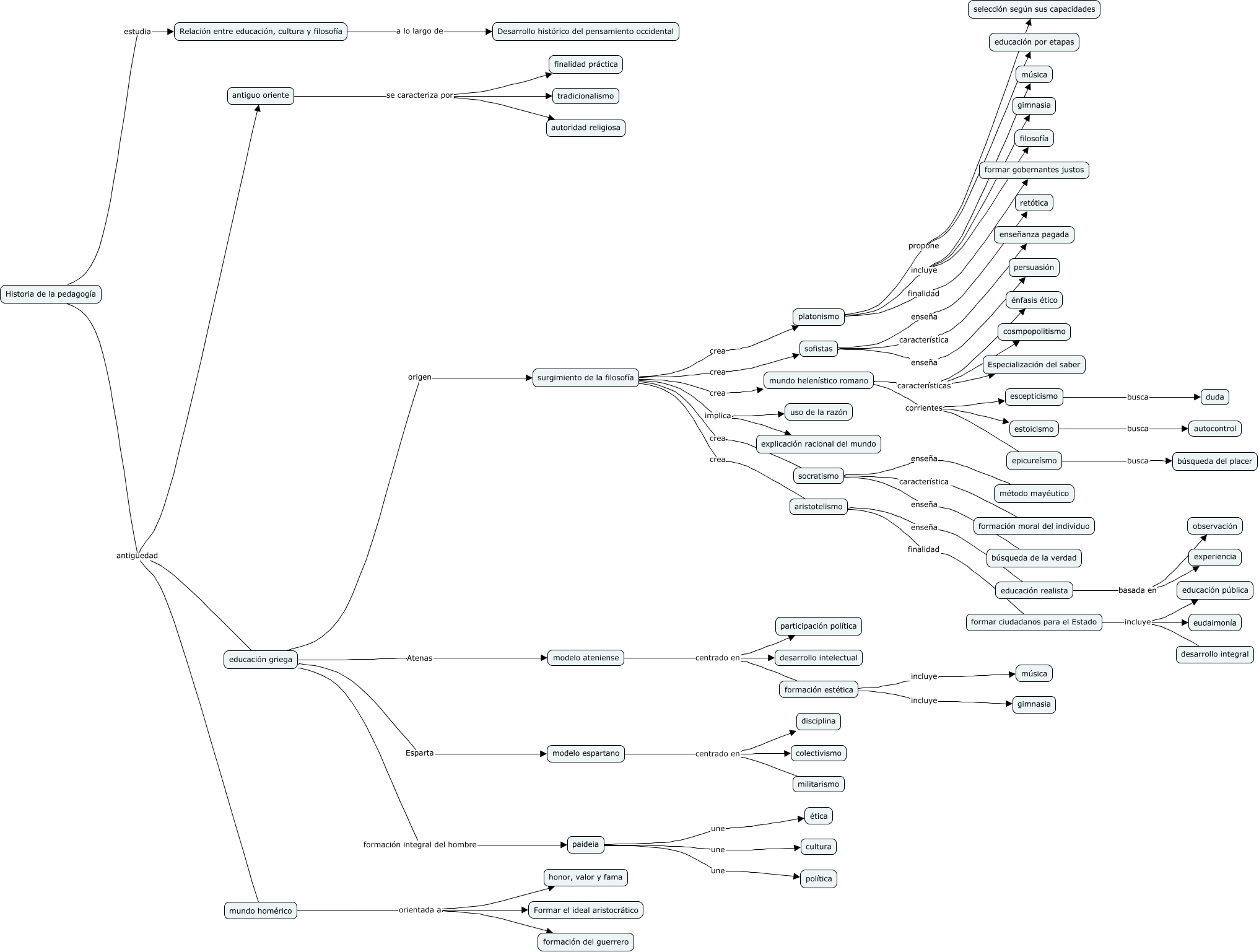 Este Cmap, tiene información relacionada con: pedagogía, socratismo característica formación moral del individuo, platonismo propone educación por etapas, mundo helenístico romano características Especialización del saber, paideia une ética, paideia une cultura, formar ciudadanos para el Estado incluye eudaimonía, antiguo oriente se caracteriza por finalidad práctica, educación griega formación integral del hombre paideia, estoicismo busca autocontrol, mundo homérico orientada a honor, valor y fama, mundo helenístico romano características énfasis ético, mundo helenístico romano corrientes epicureísmo, educación griega Esparta modelo espartano, Historia de la pedagogía antigüedad antiguo oriente, surgimiento de la filosofía implica explicación racional del mundo, sofistas enseña retótica, educación realista basada en experiencia, educación realista basada en observación, modelo ateniense centrado en formación estética, modelo ateniense centrado en participación política