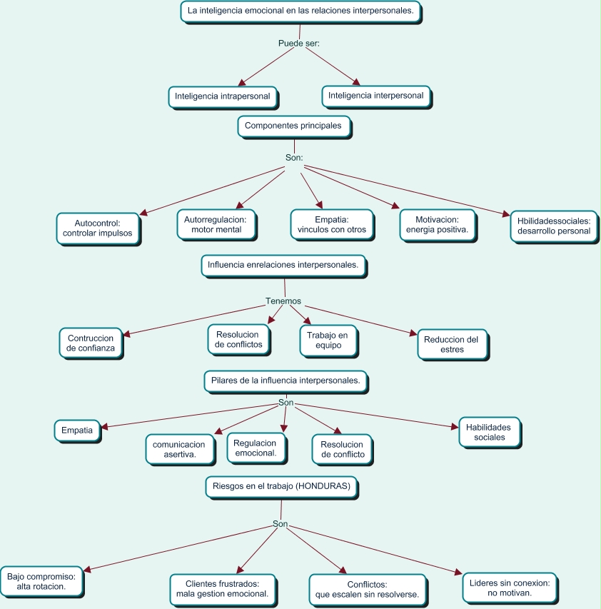 Este Cmap, tiene información relacionada con: mapa conceptual, Pilares de la influencia interpersonales. Son Regulacion emocional., Influencia enrelaciones interpersonales. Tenemos Contruccion de confianza, Pilares de la influencia interpersonales. Son Resolucion de conflicto, Influencia enrelaciones interpersonales. Tenemos Reduccion del estres, Pilares de la influencia interpersonales. Son Habilidades sociales, Pilares de la influencia interpersonales. Son Empatia, La inteligencia emocional en las relaciones interpersonales. Puede ser: Inteligencia intrapersonal, Riesgos en el trabajo (HONDURAS) Son Bajo compromiso: alta rotacion., La inteligencia emocional en las relaciones interpersonales. Puede ser: Inteligencia interpersonal, Componentes principales Son: Hbilidadessociales: desarrollo personal, Influencia enrelaciones interpersonales. Tenemos Resolucion de conflictos, Influencia enrelaciones interpersonales. Tenemos Trabajo en equipo, Riesgos en el trabajo (HONDURAS) Son Clientes frustrados: mala gestion emocional., Componentes principales Son: Motivacion: energia positiva., Riesgos en el trabajo (HONDURAS) Son Lideres sin conexion: no motivan., Componentes principales Son: Autocontrol: controlar impulsos, Riesgos en el trabajo (HONDURAS) Son Conflictos: que escalen sin resolverse., Pilares de la influencia interpersonales. Son comunicacion asertiva., Componentes principales Son: Autorregulacion: motor mental, Componentes principales Son: Empatia: vinculos con otros